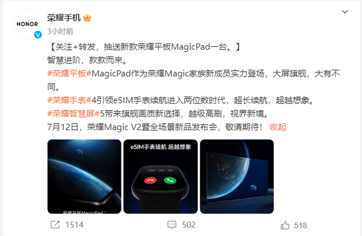 7月4日消息,荣耀在近日官宣了将会在7月12日举办新品发布会,推出全新的荣耀Magic V2折叠屏手机。而在今日,荣耀官方宣布,其在7月12日的新品发布会上会将会推出荣耀平板 MagicPad、荣耀手表 4、荣耀智慧屏 5 等一系列新品。 根据荣耀官方披露的信息,荣耀平板 MagicPad 将作为荣耀 Magic 家族新成员登场,定位“大屏旗舰,而在荣耀手表4方面,将主打超长续航,并支持eSIM功能。荣耀智慧屏5的宣传口号则是“旗舰画质新选择,越级高刷,视界新境”。 从荣耀近期的动作来看,荣耀Magic V2以及将发布的一系列新品将会有不少的亮点值得关注。特别是其中的荣耀Magic V2,根据现有消息曝光,此款折叠屏产品将搭载骁龙8 Gen 2芯片,支持66W有线快充。 |