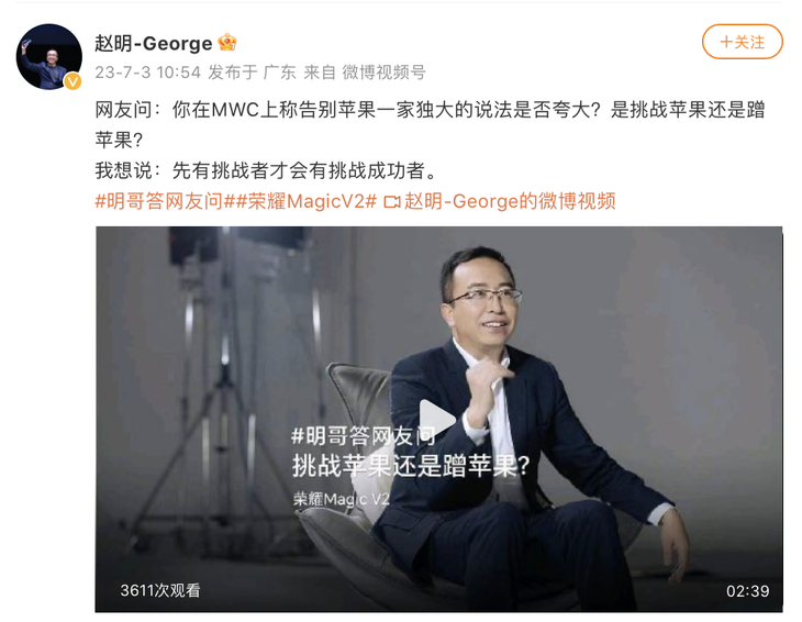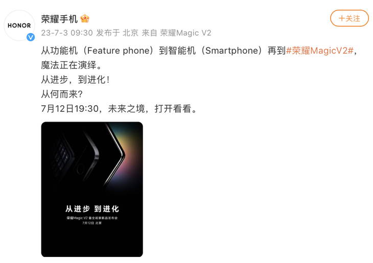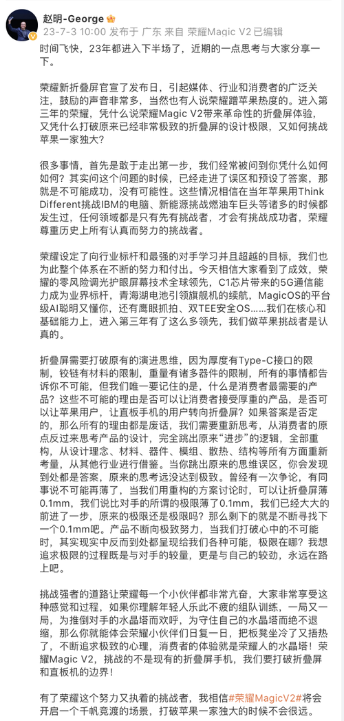 7月3日,荣耀手机官方微博公布荣耀Magic V2新机海报,这款荣耀全新折叠旗舰手机将于7月12日正式发布。也是继MWC2023官宣之后,荣耀再度为新机造势。荣耀Magic V2作为荣耀近年来爆发式创新下的全新代表作,吸引了众多国内外媒体和用户的关注。 荣耀终端有限公司CEO赵明也为Magic V2发表长文,解读了荣耀在2023年下半场对手机行业、对新折叠屏、对多项新技术的思考。并在长文中6次隔空喊话挑战苹果,目标是让苹果用户、直板手机用户能够转向折叠屏,并表示:“荣耀MagicV2将会开启一个千帆竞渡的场景,打破苹果一家独大的时候不会很远。” 从媒体和用户角度理性来看,想要挑战苹果的国产厂商不在少数。尽管全面超越苹果很难,但技术的发展就犹如一场马拉松比赛,比的是耐力、比的是投入、比的是勤奋。虽然在影像、快充、屏幕等方面,国产厂商已经领先于苹果,但距离真正的大规模平替和超越,仍有很长距离。如赵明强调的,市场需要挑战者,先有挑战者才有挑战成功者。其实无论是市场还是普通用户,我们还是喜闻这样的挑战者出现的。 经市场验证,折叠屏已是下行大盘下逆涨关键,虽然是折叠屏用户远不及直板机用户,但折叠屏凭借更大视野、更高工作效率,更多元的使用场景逐渐成为用户的选择。而这也是荣耀从独立开始就坚持要在相对小众的折叠屏市场投入大量研发的原因,战略方面荣耀看的很远。 荣耀首款折叠屏Magic V发布于2022年1月10日,向外界传递了荣耀要做全功能生产力折叠屏的讯号。并在2022年11月23日快速升级,推出大幅减重的荣耀Magic Vs,说明荣耀在折叠屏上的投入是认真的。时隔大半年,荣耀折叠屏再度来袭并全新迭代,海报中寓意着三个时代的手机典范,这一次荣耀要做强有力的挑战者。 正如赵明所说,苹果用Think Different挑战IBM的电脑,新能源挑战燃油车巨头。这一次荣耀不止要用折叠屏Magic V2挑战以iPhone,甚至是掌控用户习惯十几年的直板手机。 无论你是否是折叠屏用户都会认可一个道理,更大的屏幕、更效率的办公/娱乐、更轻便的机身、更长的续航、更好的影像才是智能手机的未来。之前限制折叠屏成为大众产品的核心原因就是重量与续航,所以在赵明带领下的荣耀才拼命死磕Magic V2的每一个“0.1mm”,挑战每一个不可能,只为让新折叠更轻薄,只有这样才能让直板用户愿意尝试折叠屏。 从官宣的海报中也不难发现,荣耀Magic V2的边框非常薄,且圆润的设计也能带来更好的手感,也很期待它是否能打破此前华为Mate X3创下的轻薄记录。 能够实现轻薄,不仅是机械结构、材料科学要实现突破,还要有电池技术。此前荣耀已经突破了青海湖电池技术,相信这次Magic V2也会采用能量密度更高的青海湖电池,进而在轻薄的基础上也能有长续航。 就笔者观察而言,今年的智能手机市场的确稍显沉闷。尽管头部厂商在影像上的努力带来了更好的拍照,也被公认超越iPhone。但若想替代苹果的确需要更革命性的体验,才能让用户放弃现有的生态。所以荣耀Magic V2这张折叠底牌可能今年最让人兴奋的产品,期待7月12日的答案揭晓。 |