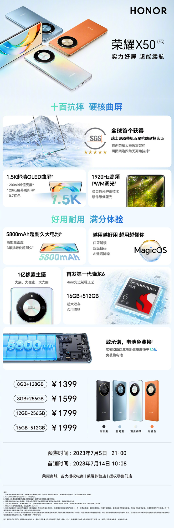 7月5日,荣耀新一代千元级主力产品--荣耀X50手机正式发布,该机首发搭载4nm第 一代骁龙6平台,配备1.5K曲面屏和5800mAh超大电池,售价1399元起。 荣耀X50带来档位首款1.5K曲屏,尺寸6.78英寸,通过硬件级低蓝光认证,搭配高频 PWM 调光技术;采用类自然光护眼与助眠显示技术,软硬结合,呵护用眼健康;支持1200nit峰值亮度,10.7亿色显示与120Hz屏幕刷新率。 同时,荣耀X50还号称是行业耐摔的曲面屏手机天花板。其获得全球首个获得瑞士SGS整机五星抗跌耐摔认证,不仅屏幕抗摔,整机十面同样抗摔。据称全新的“荣耀太极缓震架构”,通过工艺与材料的双重创新,实现两面四边四角,十面无死角的抗摔。 荣耀X50采用荣耀高能量密度电池技术,在轻薄机身下实现5800mAh超大电池容量;经历1000次充放电循环后,电池健康度依然大于80%。 荣耀X50搭载行业首发第 一代骁龙6移动平台,拥有旗舰级4 纳米先进制程工艺,性能全面升级,至高可选16+512GB 超大双存。 拍照方面,荣耀X50全新升级一亿像素大底主摄,带来1/1.67”大底、1.92微米大像素、f/1.75大光圈,支持毫秒级抓拍、全场景RAW域算法、3倍无损变焦。 外观方面,荣耀X50采用“拾光之轮”设计,提供典雅黑、勃朗蓝、燃橙、雨后初晴四款配色。 据悉,荣耀X50售价1399元起,现已开启预售,7月14日10点08分正式开售。 |