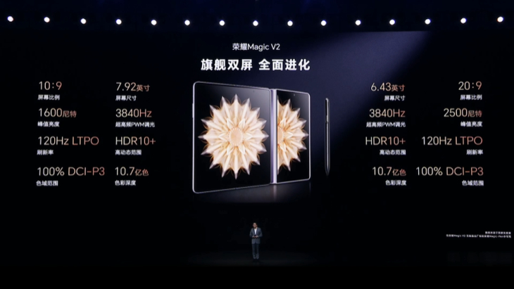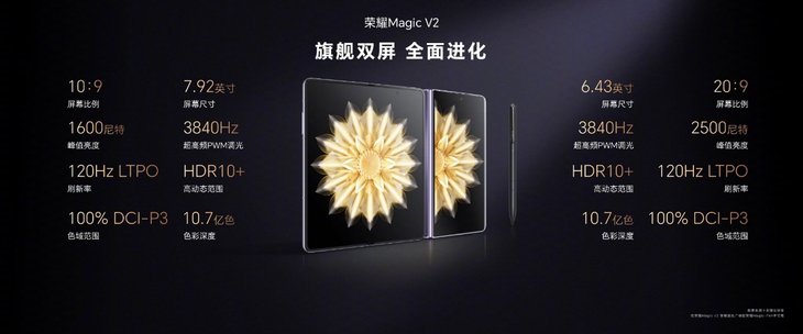 7月12日晚,荣耀Magic V2系列折叠屏手机正式发布,首次带来了9.9mm的超薄机身设计,号称“将折叠屏手机厚度带入毫米时代”。 荣耀介绍称,铰链是打造极薄折叠屏的关键。轻至231g,薄至9.90mm的荣耀MagicV2重构铰链技术,采用跨界、跨行业工艺,应用自研盾构钢,榫卯式一体成型,打造荣耀鲁班钛金铰链;通过瑞士SGS高可靠折叠品质金标认证,支持40万次折叠,可以稳定悬停,引领折叠屏手机正式进入毫米时代。 同时,荣耀Magic V2搭载荣耀新一代青海湖双电池,在轻薄机身中实现了高达5000mAh的电池容量。 荣耀Magic V2采用荣耀蝉翼液冷散热,用翅脉结构仿生探索场协同加速效应,高效解决散热难题,为用户带来轻薄长续航的产品体验 荣耀MagicV2支持双屏3840Hz超高频PWM零风险调光,搭载超动态臻彩显示,带来更加清晰真实的视觉体验;类自然光护眼与助眠显示,舒适更护眼;强大双屏内外兼修,支持更灵敏连续的批注功能;外屏采用第二代纳米微晶玻璃,外屏获得SGS五星级抗跌耐摔认证。 荣耀Magic V2搭载第二代骁龙8领先版,带来强大性能体验;全新MagicOS 7.2流畅体验全面进阶,成为首款获得 SGS 50个月持久流畅金标认证的手机;荣耀MagicV2全系搭载自研射频增强芯片,使用环绕式天线扩展技术,打造天线性能新标杆。 荣耀Magic V2系统支持分屏双空间独立运行,以及智慧隐私通话2.0、YOYO建议、MagicOS全新悬停交互体验等功能,为用户带来多场景智慧体验的进化。 荣耀MagicV2搭载全焦段实力影像,不论远近明暗,所拍皆是好风光。5000万高清主摄,精准还原照片真实细节,随手一拍都是质感大片;鹰眼精彩抓拍,智能捕捉精彩时刻;悬停影像解放双手,帮助用户一边拍一边选。 一图总结: 荣耀Magic V2系列现已开启预售,将在7月20日正式开售。Magic V2 16GB+256GB售价8999元,16GB+512GB售价9999元,有雅黑色、绒黑色、绒紫色、云霞金 4 款配色。 此外,荣耀Magic V2还提供16GB+1TB至臻版,售价11999元。 |
