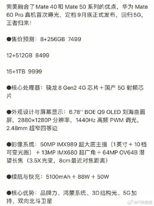 ? ? 华为近月一直有传闻将会在今年重新推出支持5G的手机,最近规格全面流出的旗舰机Mate 60 Pro已有消息指会是首款重新支持5G网络的手机,并且华为这次怎样做到支持5G网络也同时揭秘。 ? ? 据悉华为Mate 60 Pro将配备6.78英寸2800 X 1280分辨率曲面刘海屏幕,搭载8 Gen 2 4G芯片,属今年高通最顶尖的芯片,而能支持5G的秘密则在于还额外加入了国内自行研发的5G射频芯片。 ? ? 华为Mate 60 Pro拍摄方面会配备IMX989型号的1英寸5000万像素感光元件主摄,主摄可进行10段光圈切换,超广角镜头为1300万像素,搭载的是IMX680感光元件,潜望远摄镜头为3.5X,搭载1/2.0英寸的6400万像素感光元件,拍摄规格比华为P60 Pro再进一步。 ? ? 华为Mate 60 Pro会于9月底发布,具备8GB/256GB、12GB/512GB及16GB/1TB存储选择,预测定价至高为9999元。 |