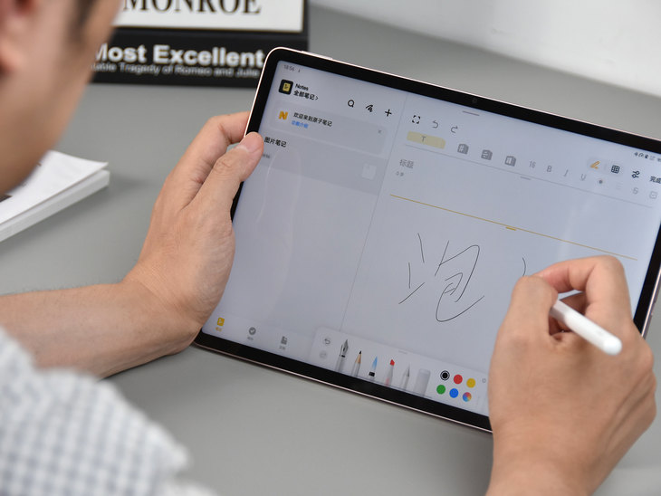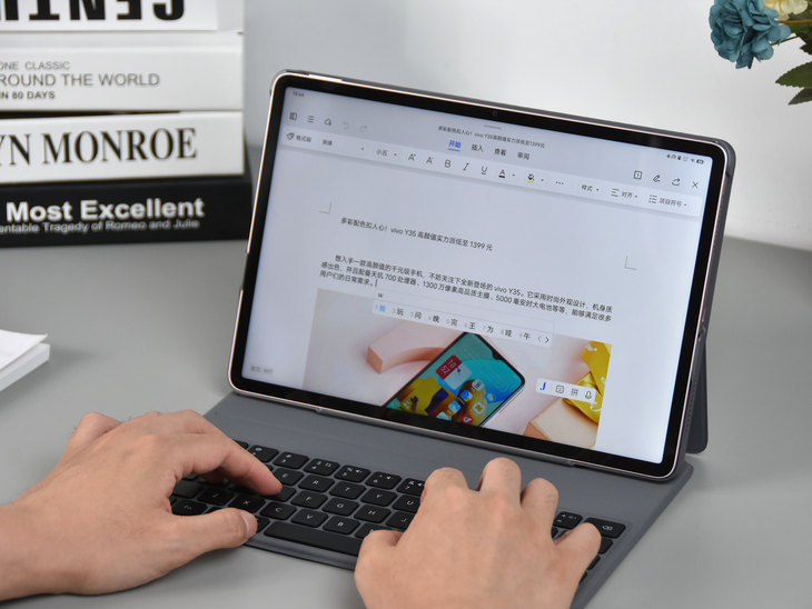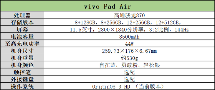 Air实际上属于升级款产品,其拥有尺寸更大且素质更好的屏幕,能够带来更出色的娱乐办公体验。 本篇文章,笔者便为大家详细介绍vivo Pad Air这款新平板。此次的评测机型为8+256GB存储版本,外观版本为勇敢粉。 轻薄高颜值 vivo Pad Air平板电脑拥有自在蓝,勇敢粉,轻松银这三种外观配色版本可选,均是年轻时尚的配色。从外观配色也能够看出,vivo希望这款新平板获得更多年轻人的青睐。 此次评测机的勇敢粉外观配色属于淡粉色,配合vivo Pad Air的金属一体化机身设计,整体无论是看上去还是摸上去都非常有质感。vivo自主研发的创新型谐振腔天线隐藏在全金属机身之下,兼顾高强度和轻薄设计之余也拥有更好的信号表现。 在配备11.5英寸大屏幕的同时,这款平板电脑还兼顾了轻薄设计。其机身重量约约530g,机身厚度约6.67mm,机器握持手感很不错,携带起来也非常方便。 在屏幕配置上,vivo Pad Air平板电脑采用了一块11.5英寸超感原色屏,其分辨率为2800x1840,刷新率为144Hz,具备10亿色显示以及电影级的P3广色域覆盖,支持HDR10高动态范围,通过ZREAL帧享超高清认证。 这款屏幕也具备良好的护眼功能,通过德国莱茵T?V低蓝光护眼认证,能够有效缓解用眼疲劳。同时这款屏幕还特别设计有舒眠模式,可根据夜间时间变化逐步调整?温,匹配?体褪?素分泌规律,护眼同时?保证睡眠质量。内置的?温传感器,可依据环境光?动调节?温,让屏幕显示效果更好地融?环境,带来舒适浏览体验。 2022年推出的vivo Pad 平板电脑采用的是一块11英寸、2.5K分辨率、120Hz刷新率屏幕。对比之下,全新的vivo Pad Air在屏幕方面的提升是非常明显的。 实际观感上,vivo Pad Air这块11.5英寸超感原色屏画面逼真细腻,欣赏照片,观看视频效果均很出色。对于画质有较高要求的用户们来说,vivo