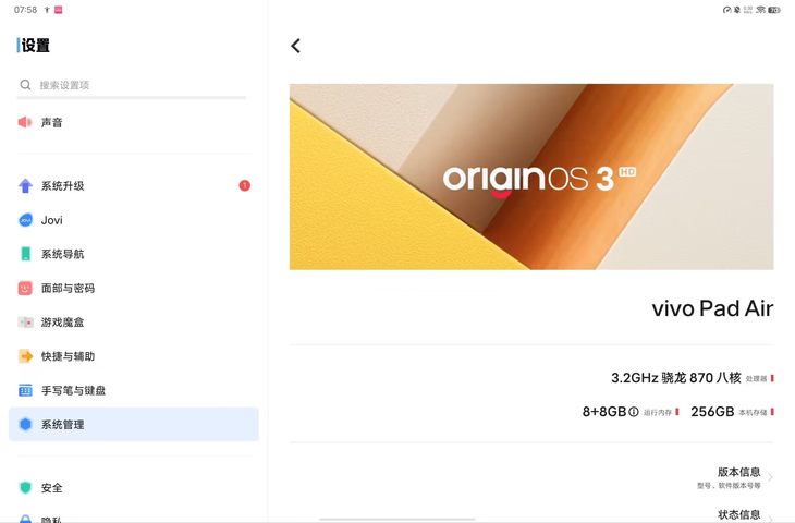 Air,也能够带来很应手的操作体验。 OriginOS 3 HD操作系统与?效跨屏?态 vivo Pad Air平板电脑当前搭载OriginOS 3 HD,该操作系统现已覆盖4000+款热?应?,可获得更?效的横屏浏览。 OriginOS 3 HD还拥有?效跨屏?态,能够令vivo Pad Air平板电脑与vivo自家智能手机进行高效的跨屏协作,成为用户更得心应手的生产力工具。 vivo Pad Air平板电脑采用自主研发的投屏协议,针对性优化数据传输信道,并能在平板上直接操控手机、相互拖放文件。从实际的体验来看,除了首次连接时需要一些操作步骤的等待时间,之后连接都非常的迅速顺畅。另外,无论是在手机上滑动操作还是在平板上,均没有感觉到有延迟的情况。 一碰就能进行投屏 vivo Pad Air屏幕右上方内置了NFC模块,在完成配对连接后只需同手机碰?下平板右上角,就能实现vivo Pad Air与手机的跨屏协作,相当方便。?机上的视频、游戏、应?碰?碰,即可在平板上继续呈现。 多?位?童守护功能 vivo Pad Air还专为儿童设计了“健康使用设备”功能,家长们可以放心给孩子使用这款平板。 在vivo Pad Air里面,可为孩?单独创建帐号和独?系统空间,更有专属的?部识别,孩?解锁直接进?独?纯净的系统空间。 家长通过?机还可以绑定孩?平板帐号, ?持应?使?时?、学习专注时?和远程定位等全?的远程伴学管理功能。 同时vivo Pad Air还可提供多方位的健康守护功能,例如护眼模式、光线提醒、抖动环境提醒、距离屏幕过近提醒、躺着看屏幕提醒、坐姿不端正提醒、休息提醒等等。家长不在身边,vivo Pad Air也可以有效保护孩子的健康,特别是视力健康,很是贴心。 产品总结 不俗的硬件配上成熟度非常高的OriginOS 3 HD操作系统,造就了vivo Pad Air出色的产品体验。总的来看,这款平板电脑应用范围非常广,老少皆宜,家用娱乐、协作办公皆可胜任,值得笔者向大家力推。更有诱人的是,它的价格还非常实惠,首发价只要1699元起。 最后,vivo Pad Air已于8月18日正式开售,心动的用户们可以到vivo官方商城、京东、天猫等网络渠道购买。vivo Pencil2触控笔和vivo 智能键盘 Air属于选配产品,大家可以根据自身需求选择。 |