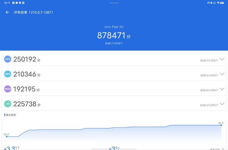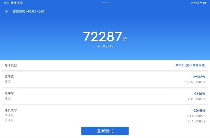 Pad Air值得拥有。 平板对于影音方面的要求较高,所以vivo还为这款平板电脑配备了四声道超线性扬声器,上下各两个,9.4cc超??腔,总功率?达6W,配置在同级别产品当中处于优秀水准。同时搭配vivo金耳朵声学团队专为平板打造的Super Audio 5.0计算?效,支持动态低?增强、动态?量增强、AI?声增强、3D实景?频,能够提供出色的音质表现。 前置500万像素摄像头。 后置800万像素主摄像头,并且配备闪光灯。 开机键。 +、-按键。 Type-C接口,支持至高44W闪充。 这款平板电脑的侧边还设计有手写无线充电磁吸条,可适配vivo Pencil2触控笔。 vivo Pencil2触控笔与原?笔记应?强强联合,可提供丝滑的书写笔记体验。笔身内置的书写引擎,可带来媲美真实书写体验的?感。熄屏速记、截屏标注、智能图形绘制等功能应有尽有,演示PPT时轻划笔身还可控制翻?。 这款平板电脑还可支持vivo 智能键盘 Air。平板PC二合一,用户可随?切换使用。接上vivo 智能键盘 Air之后,与PC使?习惯保持?致,轻松上手。 vivo 智能键盘 Air支持卡扣蓝??动配对,?吸即?。支持60?/67?双?度?撑调节,办公、学习、观影、绘画等多场景适?。 高通骁?870助力流畅体验 核心方面,vivo Pad Air平板电脑搭载骁龙870处理器,其采用7nm制程,CPU采用Kryo 585八核架构,主频至高提升至3.2GHz,较前代提升12%。GPU采用Adreno 650,较上代提升10%。支持Wi-Fi6及蓝牙5.1音频技术;采用第五代AI引擎,支持15 TOPS算力的同时带来更低功耗。 在安兔兔的跑分测试中,这款8+256GB存储版本的vivo Pad Air获得超过87万的成绩,性能依然不错。 存储读取测试中,这款vivo Pad Air的顺序读取速度达到 1737MB / s,顺序写入速度达到811.3MB / s,表现也不错。 在日常轻娱乐方面,vivo Pad Air操作流畅,配合这块144Hz高素质屏幕,能够提供很出色的体验。 在日常的轻办公方面,vivo Pad Air速度依旧流畅,配备vivo Pencil2触控笔以及vivo 智能键盘