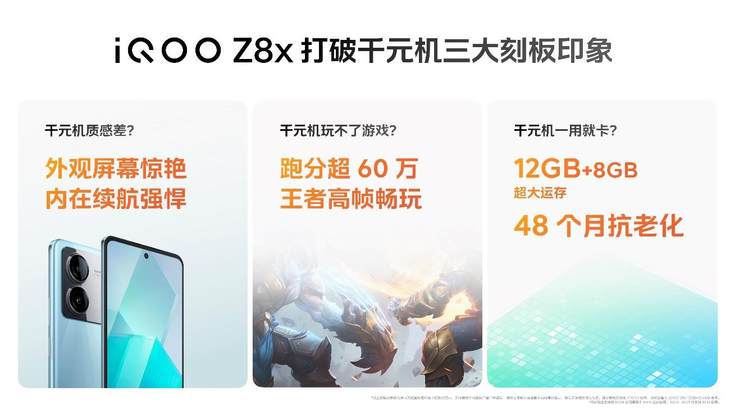 2023年8月31日,“天玑 8200 性能小超人”iQOO Z8系列正式发布,包括iQOO Z8和iQOO Z8x两款产品,首销售价1199元起。 “天玑 8200 性能小超人”iQOO Z8倾力打造“优秀千元性能机”:搭载具备巅峰性能的天玑 8200 ,携手满血版LPDDR5和满血版UFS 3.1组成“满血性能铁三角”,带来千元产品中领先的性能表现,更有同价位充电速度领先的120W 超快闪充和护眼的零感蓝光原彩屏,搭配6400万像素OIS主摄、高颜值设计和全面越级体验,实力全面强悍;“性能小超人”iQOO Z8x具备6000mAh巨量电池和高通骁龙 6Gen1,是一款性能出色的超长续航手机。 巅峰性能天玑 8200 ,千元满血性能强机 巅峰性能,满血实力。iQOO Z8搭载经过12个月精心调校的天玑 8200 ,性能直达巅峰,与满血版LPDDR5、满血版UFS 3.1组成“满血性能铁三角”,安兔兔V10跑分高达980,832分,强悍性能在千元级产品中处于领先。同时,iQOO Z8提供至高12GB+512GB组合可选,支持内存融合 3.0,满足用户对于强悍多任务和海量存储的需求。另外还支持48个月抗老化,可以让用户久用如新。 得益于“满血性能铁三角”,iQOO Z8带来优秀的高帧游戏体验,能够以近满帧地持续运行《王者荣耀》120帧1小时,实力不凡。 让功耗控制本就优秀的天玑 8200 “好上加好”,iQOO Z8配备Z系列史上最具实力的3K VC冰极立体散热,拥有3002mm2豪华均热板,散热总面积相对上代产品提升25%,强悍散热性能在千元机中实属领先,足以让iQOO Z8满血性能尽兴“狂飙”。 好的网速,也很重要。iQOO Z8支持新一代高性能天线布局,Wi-Fi 5G穿墙能力相对上一代产品提升30%,还具备超速网络引擎,支持超低时延引擎、地铁模式和电梯模式,让用户无论是玩游戏、看视频还是上社交平台,随时随地都很快。另外,iQOO Z8还具备红外遥控、全场景NFC和3.5mm耳机孔等数据连接功能。 120W 超快闪充配大电池,或是同档充电领先 千元产品超快充电速度降临!iQOO Z8搭载120W 超快闪充,至快10分钟就能将内置超大电池充近一半,充电速度越级比肩行业旗舰,或将成为同价位中充电速度领先的产品。原装充电头还支持65W PD协议,配合原装数据线,能够为支持PD协议的多数耳机、平板、笔记本、手机进行快充。 iQOO Z8配备支持超长续航的等效5000mAh的超大电池,满电状态下可以刷短视频12小时,支持手机强悍实力持久输出;不但充得快还要用得久,在经过1460次完整充电循环后,电池健康度大于80%,以一天一充为计算,iQOO Z8能让用户安心畅玩四年之久。 护眼零感蓝光原彩屏,游戏操控体验全面出彩 护眼好屏一直是Z系列拿手好戏,iQOO Z8配备零感蓝光原彩屏,带来具备芯片级智能护眼的硬件级低蓝光,相同条件减少有害蓝光50%,全系通过SGS低蓝光认证;凭借前置色温传感器,支持屏幕色温自适应,带来真实、舒适观感,其他还有抗疲劳亮度调节、舒适模式和游戏护眼功能,全方位护眼功能让用户双眼得到精心呵护。 护眼之外,iQOO Z8的屏幕色彩同样出彩,首次带来出厂屏幕逐台校准,拥有更精准的色温和色彩表现,支持100%电影级P3色域显示,能够还原真实世界色彩。 iQOO Z8带来全面优秀的感知体验,搭载封闭式立体双扬声器,首次支持游戏场景下的声场拓宽算法,充分放大双扬的方向感,让听声辨位更轻松;具备X轴线性马达,振感反馈利落、干脆;支持体感操控,拓展游戏操控维度。再配合iQOO专业的游戏体验调校,iQOO Z8在操控感知上可谓全面优秀。 6400万像素OIS主摄,首现50mm黄金焦段人像 iQOO Z8搭载6400万像素OIS光学防抖双摄,支持4K超清视频、纯净夜景、超级月亮、悬浮运动抓拍、动感追焦摇镜、复古胶片滤镜和珍藏水印等功能,为用户带来既好拍又好玩的影像体验。 iQOO Z8首次在Z系列中支持50mm黄金焦段人像拍摄,通过主摄硬件Remosaic功能,结合专业景深虚化镜头,进行2x人像拍摄,叠加影棚级质感人像算法,拍出细腻皮肤质感及立体五官,每一拍都如同写真。 Z系列高颜值设计,全新“星月夜”配色 简约即美,清新脱俗。iQOO Z8以全新“星月夜”配色在一众千元机中脱颖而出,“月瓷白”、“星野青”和“曜夜黑”三大配色,为用户带来高颜值机身。“月瓷白”和“星野青”采用釉面凝光工艺,后盖仿若釉面的平整光洁,耐刮耐磨并且能够抗老化,让颜值始终在线;“曜夜黑”则采用新一代星光AG工艺打造,哑光磨砂背盖点缀亮面镜片,手感舒适。 质量牢靠也很重要,iQOO Z8具备能够承受1米滚筒跌落300次的极限主板保护能力、通过50℃高温炙烤4小时和-20℃快速冷冻4小时的“极限温度测试”,以及60℃恒温水浴96小时的“屏幕耐久测试”,优秀的质量表现让人用得更安心。 iQOO Z8x同台亮相,高性能超长续航手机 “性能小超人”iQOO Z8x具备6000mAh巨量电池和跑分超60万的高通第 一代骁龙6,支持《王者荣耀》90帧模式,并在同档产品中首次提供12GB大运存,手机还具备零感蓝光原彩屏、五重冰封液冷散热、150%超级扬声器和可以拍摄4K超清视频的5000万像素AI防抖主摄,支持48个月性能抗老化,是一款性能出色、售价超值的超长续航手机。 售价方面,iQOO Z8共有3个版本可供选择,8GB+256GB版本售价1699元(首销减100,仅需1599元)、12GB+256GB版本售价1799元、12GB+512GB版本售价1999元;iQOO Z8x也有3个版本可供选择,8GB+128GB版本售价1299元(首销减100,仅需1199元)、8GB+256GB版本售价1399元(首销减100,仅需1299元)、12GB+256GB版本售价1499元;首销期(8月31日晚上19:40至9月9日24:00)购买iQOO Z8系列,赠送XE160耳机,并可