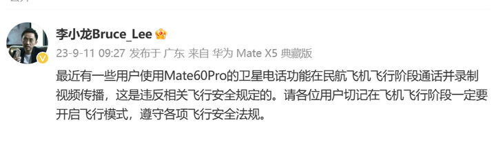华为Mate 60 Pro系列支持卫星通话功能,是该手机非常大的一个亮点,基于北斗卫星系统的地面终端设备,通过将手机与卫星连接,实现无障碍通信。这种技术在很大程度上解决了传统通信方式在特殊环境下的局限性,让我们的生活更便利。但近期有不少机构和博主、用户纷纷进行了实测,有些已经不满足在深山地区,而是将它带到了更加博人眼球的地方,比如正在飞行的飞机上。 针对此事,华为终端BG CTO李小龙特意发布消息提醒称:最近有一些用户使用Mate60Pro的卫星电话功能在民航飞机飞行阶段通话并录制视频传播,这是违反相关飞行安全规定的。请各位用户切记在飞机飞行阶段一定要开启飞行模式,遵守各项飞行安全法规。 在一些博主公布的实测视频里,可以看到由于机舱遮挡,只能通过窗户来搜寻微型,不过由于窗户面积小,而且飞机是在移动中,并不能很顺利连接卫星。 |