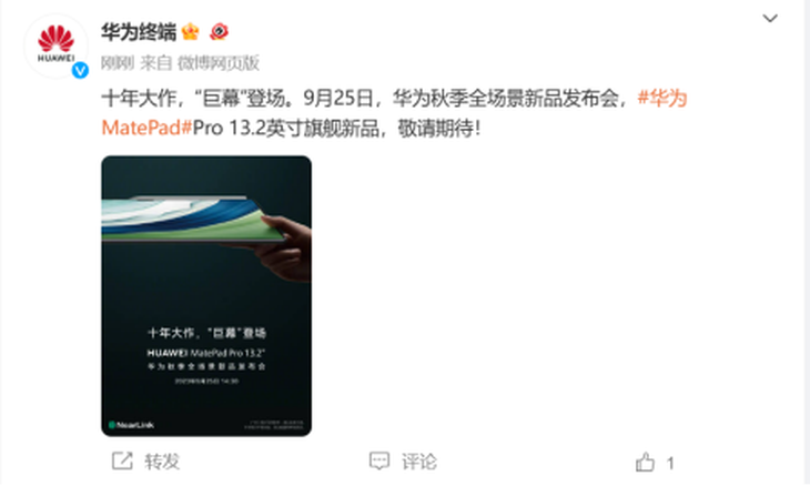 今日,华为终端官方微博发布新款华为MatePad Pro旗舰新品预热海报,华为终端BG CEO余承东对该微博进行了转发评论。海报显示,相比上代产品,此次华为平板十年大作MatePad Pro将屏幕尺寸升级至13.2英寸。与此同时,海报上还印有星闪logo,表明新款平板和手写笔会搭载华为星闪技术,华为MatePad Pro将是首款星闪产品,平板手写体验也将迎来重磅升级。 到底何为星闪技术,这里有必要跟大家简单介绍一下。在今年8月举行的华为开发者大会上,华为正式发布了新一代近距离无线连接技术——星闪(NearLink)。其中星闪技术可为为鸿蒙生态带来更强大的连接性能,满足多个场景的应用需求,为用户带来更高效的连接体验。 星闪技术具有更低延时、更精准同步、更高可靠性、更低功耗的优势。根据华为官方公布的测试数据,NearLink相比当下的蓝牙技术,在功耗方面降低了60%,传输速率提升至6倍,覆盖距离增加至2倍,在更大组网方面则实现了10倍的连接数。 可以说,星闪技术能够满足新场景对高质量短距无线连接的需求,将为鸿蒙万物互联提供更强大的连接实力。根据目前的技术发展来看,星闪技术的应用范围相当广泛,能够适用于消费电子、智能家居、新能源汽车、工业智造等多种场景。 此次新款华为MatePad Pro及手写笔搭载了星闪技术之后,将带来更稳定且更精准的手写体验。同时,新款华为MatePad Pro相比上代产品拥有更大的屏幕,屏幕尺寸升级至13.2英寸,边框设计应该是变得更窄了,不仅视觉冲击力更强了,也为手写操作提供了更大的运作空间。从机身侧面可以看出,新平板的设计会更薄,重量可能也会随之减轻,携带性估计更强了。 领先的硬件技术配上超大的屏幕尺寸,将令华为平板电脑成为更多用户得心应手的生产力工具。对于新款华为MatePad Pro 13.2英寸来说,更大的屏幕、更轻薄的机身以及将搭载的星闪技术足以让人惊喜。或许不少读者会问:这款新平板还有没有其它亮点?据相关数码博主爆料,新款华为平板还有可能搭载5G、新鸿蒙系统、麒麟芯片,有望引领大尺寸平板的发展。 9月25日,新款华为MatePad Pro 13.2英寸将与其他产品一同发布,敬请期待! |