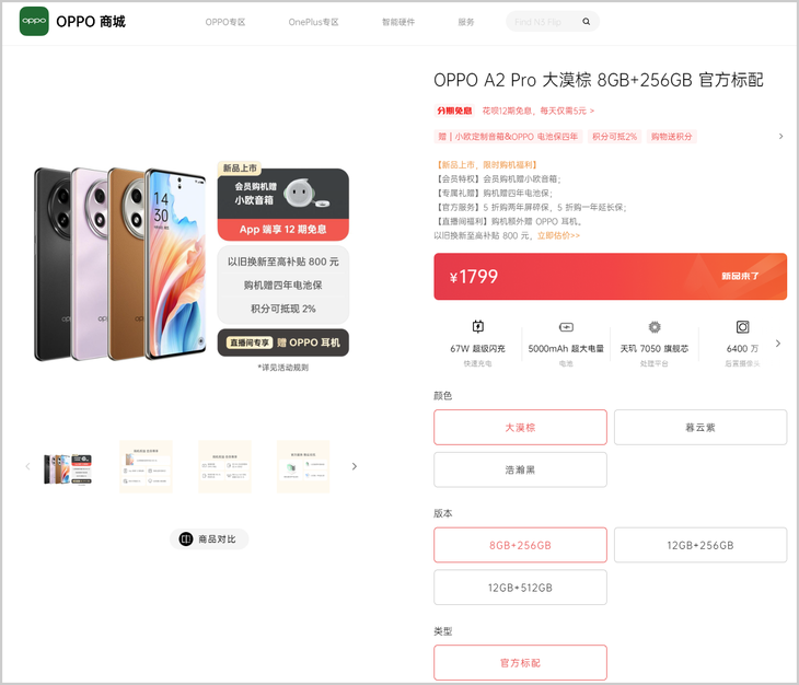Pro就是代表,配置与调教皆给力,值得追求实惠价格的消费者关注。 OPPO A2 Pro搭载是今年上半年联发科新推出的天玑7050芯片,至高搭配12GB+512GB超大存储。天玑7050是一款性能优异的中端芯片,采用台积电6nm制程工艺,具备八核CPU架构,包括两颗主频为2.6GHz的Arm Cortex-A78性能核心和6颗Cortex-A55 2.0GHz核心,集成Arm Mali-G68 GP,相比上代产品来说在性能和功耗上都更有优势。 屏幕方面,OPPO A2 Pro搭载一块6.7英寸FHD+分辨率的双曲面屏,并且这块屏幕的配置也完全不输高端手机,不仅具备120Hz流畅高刷新率,同时还覆盖100% DCI-P3电影级广色域,屏幕显色媲美电影级标准。此外,A2 Pro还采用领先的2160Hz PWM超高频调光,不仅能带来更加舒适的低亮度观看体验,也解决了低亮度下软件类DC调光带来的画面杂色问题。并且手机全局激发至高亮度可达800nit,局部峰值至高亮度可达950nit,即使身处强烈阳光下也能让我们看清屏幕显示内容,使用起来非常方便。 在影像方面OPPO A2 Pro也有不俗表现,后置搭载双摄组合,其中主摄配备了6400万像素镜头,通过像素四合一技术,单像素可以达到1.4μm,进光量更大,在暗光环境下表现更加出色。尤其是在超清夜景模式下,搭配更出色的夜景算法,夜晚随手一拍就能很容易拍摄到一张质感出色的夜景照片。 超给力的续航也是这款千元机的一大优势,OPPO A2 Pro不仅内置了5000mAh容量超大电池,并且支持67W超级闪充,利用午休或者茶歇的闲暇时间,这款手机即可快速“复活”。 系统方面,OPPO A2 Pro搭载的ColorOS 13.1系统不仅具有流畅的使用体验,还采用了自主研发的系统级计算中枢,通过四大计算引擎进行综合调优,定制了系统级技术方案,更好的提升系统的流畅性和稳定性。这些优化措施能够增加后台常驻应用的数量和应用的后台驻留率,从而提高应用的启动速度和使用的连贯性。 并且在ColorOS 13.1的支持下,这款手机还能根据生活场景和行为习惯,打造人与设备间更加自然无感的交互体验。比如出行前后每一个重要信息都及时推送给我们,如打车的车牌号、到达时间、飞机落地时自动提醒行李转盘信息等,都会及时在手机进行通知提醒。 关于它的价格,目前8GB+256GB版本1799元,12GB+256GB版本1999元,12GB+512GB版本2399元,价格总体上也是相当实惠。对于这款入门级实力派新机,笔者力推! |