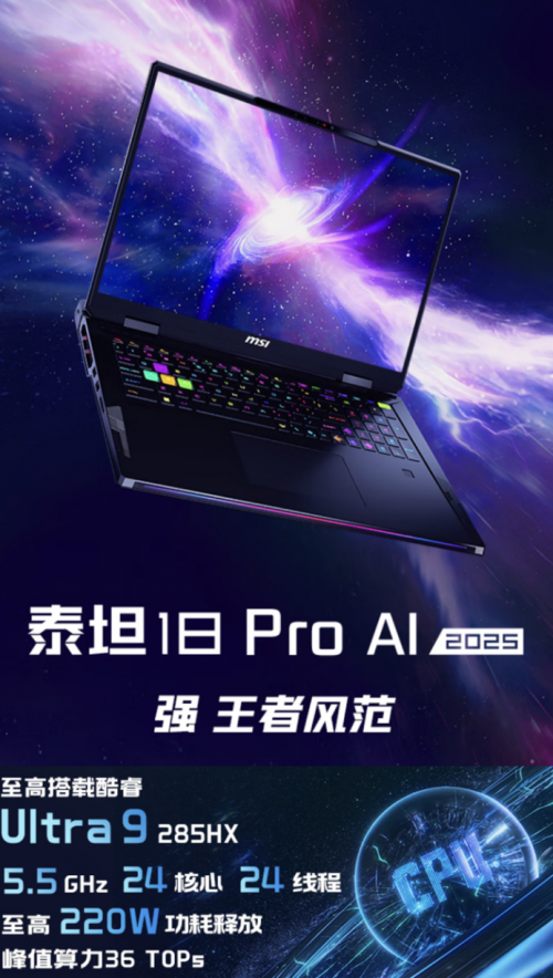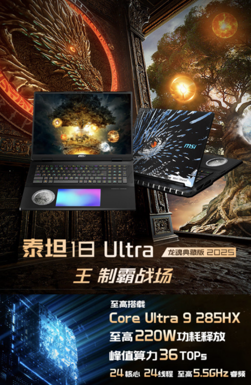 英特尔全新推出的酷睿Ultra 200HX系列处理器引发了游戏玩家们的关注,微星(MSI)搭载酷睿Ultra 200HX处理器的泰坦18 Ultra龙魂典藏版2025、泰坦18 Ultra AI 2025、泰坦18 Pro AI 2025、泰坦16 AI 2025四款新一代游戏本新品在京东先人一步开售,下单可享政府补贴20%的优惠,立省2000元。开售后,这四款笔记本的首批货量已迅速被用户抢购一空,第二批货也即将上线,想要体验微星新一代游戏本的玩家可以持续关注京东。 英特尔酷睿Ultra 200HX系列处理器专为高端游戏玩家和专业设计人士量身打造,性能表现全面突破。相比上代产品,其AI算力提升2.5倍,AI生图速度提升2.3倍,多核性能与能效比分别提升20%和21%,无论是3A游戏高帧率运行,还是专业创作渲染,均能兼顾高性能与低功耗。性能和硬件方面的提升,也是此次微星首批新一代搭载了英特尔酷睿Ultra 200HX的游戏本京东开售即售罄的原因所在。 此次京东首发的诸多微星游戏本新品中,泰坦18 Ultra龙魂典藏版2025堪称旗舰游戏本的信仰之作。A面金属蚀刻龙魂,由大师级工匠手绘而成,先进的金属蚀刻技术让设计栩栩如生,腕托上的龙魂图腾设计,更显立体感。除了外观上的震撼,泰坦18 Ultra龙魂典藏版2025的硬件性能上更是达到顶配。搭载酷睿Ultra 9 285HX处理器,24核心24线程,最高睿频5.5GHz。搭载至高175W满功耗的RTX 5090,还有Mini LED面板加上4K画质,将真实感和细节提升到一个全新水平,不管游戏还是观景都沉浸感十足。目前,在京东下单RTX 5080版本,叠加国家补贴优惠到手价41999元,下单RTX 5090版本,叠加国家补贴优惠到手价49999元,购机还赠2年意外险,评价晒单送京东E卡。 泰坦18 Ultra AI 2025,采用Mini LED显示屏,拥有4K+的超高清分辨率,支持更广阔的色域和色彩准确性,无论是自然万物的缤纷色彩,还是特定场景下的光影色泽,都能真实呈现。至高搭载酷睿Ultra 9 285HX处理器,至高220W功耗释放,配合RTX 5090显卡以及强大的AI算力,为玩家们带来升级体验和更逼真的画面。目前,在京东下单RTX 5090版本,叠加国家补贴优惠后,到手价44999元,购机还赠2年意外险,评价晒单送京东E卡。 泰坦18 Pro AI 2025,至高搭载酷睿Ultra 9 285HX处理器,以及至高搭载RTX 5090显卡,为玩家们呈现沉浸式游戏体验。18英寸屏幕、4K+高分辨率、100%DCI-P3广色域以及微星的True Color色彩调教技术,无论是游戏中的炫目特效,还是专业设计时的色彩呈现,都能为用户提供极致的视觉享受。目前,在京东下单RTX 5080版本,叠加国家补贴优惠到手价28999元;下单RTX 5090版本,叠加国家补贴优惠,到手价34999元;购机还赠2年意外险,评价晒单送京东E卡。 泰坦16 AI 2025,至高搭载酷睿Ultra 9 275HX处理器,配合至高RTX 5080 GPU,全新Blackwell架构显卡,不仅有出色的视觉体验,更有超快的响应速度和栩栩如生的图像效果,240Hz高刷电竞屏的加持,为用户带来震撼的视觉效果和流畅的游戏体验。目前,在京东下单,叠加国家补贴优惠,到手价12999元,购机赠1年意外险,评价晒单送京东E卡。 全新的酷睿Ultra 200HX处理器为高性能笔记本带来了高能效和卓越的AI特性,微星英特尔酷睿Ultra HX系列新品游戏本还配备了微星AI智能引擎,一键即可激活AI感知,让用户可以专注于创作、工作和娱乐。想要体验顶尖游戏性能和卓越视觉享受的玩家们,锁定京东,即刻开启一场热血沸腾的游戏之旅,享受无与伦比的游戏快感。 |