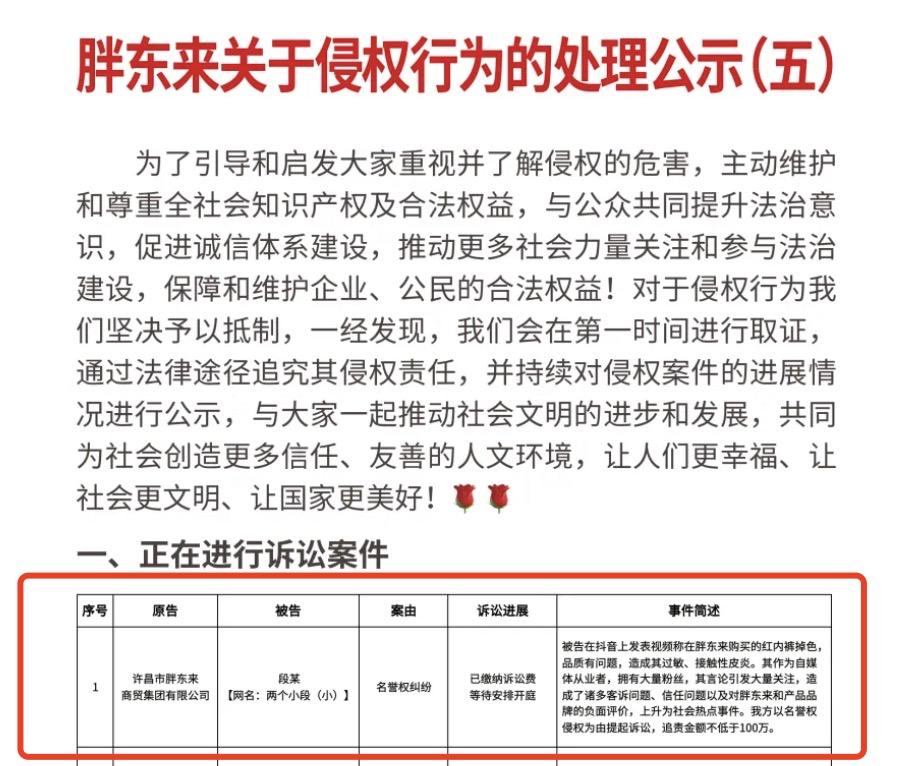 4月5日晚,“胖东来商贸集团”公众号发布关于侵权行为的处理公示,以名誉权侵权为由,对“红内裤”事件博主段某提起诉讼。 胖东来表示,段某在抖音上发表视频称在胖东来购买的红内裤掉色,品质有问题,造成其过敏、接触性皮炎。段某作为自媒体从业者,拥有大量粉丝,其言论引发大量关注,造成了诸多客诉问题、信任问题以及对胖东来和产品品牌的负面评价,上升为社会热点事件。胖东来以名誉权侵权为由提起诉讼,追责金额不低于100万。目前案件正等待安排开庭。 2月4日,网红“两个小段”发布视频称,自己清洗从胖东来购买的红色内裤发现掉色,并且在使用后有过敏反应。在进行投诉后,她表示胖东来工作人员的处理方式让人生气,感到不被尊重。 胖东来当日发文回应称已组建专项调查小组并下架涉事品牌系列产品,2月6日,胖东来再次发文,承认在管理中存在问题并向顾客致歉,同时表示会在调查结果出来后第一时间进行公示。 2月14日,胖东来发布《关于“红色内裤掉色、过敏以及部门处理过程”的调查报告》。调查报告多达53页,内容十分详细记录了事件起因、经过、处理方案、整改方案以及商品检测方案等。 《调查报告》称综合三家检测机构检测结果可以认定,胖东来服装部销售的中山市民伟制衣有限公司旗下“富妮来品牌”女士基础舒适内裤为合格商品。不过依据《胖东来客诉处理标准》,胖东来给予顾客发放500元投诉奖,跟踪顾客健康恢复状况并承担相关医疗费用。 同时,胖东来在调查报告中提到结合其发表的视频引起的社会关注及影响,涉嫌严重侵犯公司名誉权!对于任何侵害胖东来公司名誉、商誉等合法权益的行为,胖东来法务将坚决依法维权!综合评估胖东来品牌价值及社会影响力对于严重侵权的行为,原则上追责金额不低于100万元。 3月14日,胖东来红内裤事件当事人“两个小段”发布声明,表示关于其是“职业打假人”“多次恶意投诉”“偷盗胖东来购物车”等言论纯属编造,并晒出立案告知书,已就被诽谤一事报案。“关于通过不当手段获取本人个人信息,上门恶意辱骂,恐吓等行为已严重威胁自己和家人的生命安全,影响正常生活,若再有发生将依法追责。” 其声明还称自己没有任何运营团队,相关事件虽是基于事实情况进行表述,但由于自己的表达情绪化,引起负面影响,占用公共资源,对此真诚道歉,以后会更加谨言慎行。 |