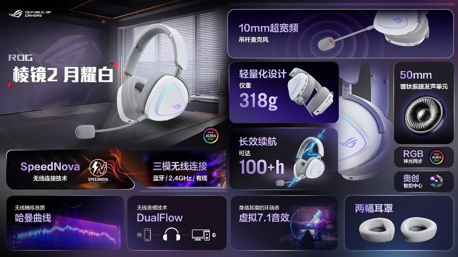 ROG 棱镜2 月耀白推出全新配色,干净纯洁的机身颜值非常高。支持无线三模连接,能适应多种环境。采用ROG SpeedNova技术,不仅连接稳定,还能提供长效续航与超低的功耗。此外,它还支持DualFlow 音频技术可同时2.4G和蓝牙连接2台设备并同时播放,游戏过程中如有来电只需按下耳罩上的按钮即可接听电话,便捷性也大大提升。