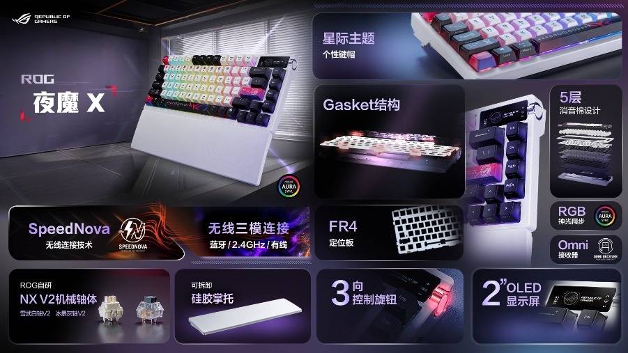 ROG夜魔X机械键盘采用了PBT热升华三面透光键帽,上面印有星际主题图案,十分炫酷。搭载全新的NX轴 V2,可以完美兼容Cherry键帽,手感一流。五层消音结构和FR4定位板,提供别具一格的新手感。ROG夜魔X还采用下灯位热插拔PCB设计,升级后的灯效流光溢彩。同时还配备了非常舒适的硅胶腕托,玩家的游戏体验也会相应升级。