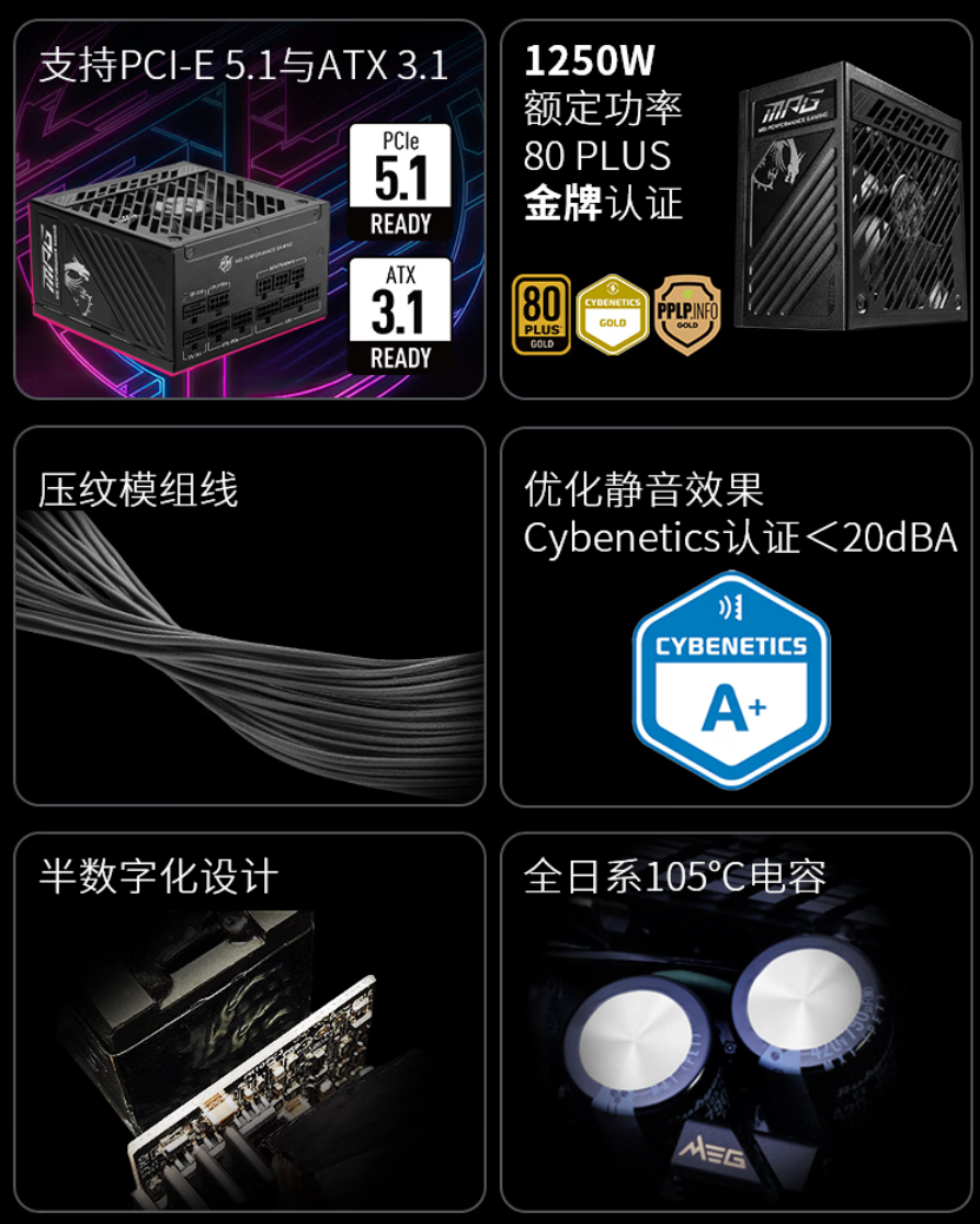 微星(MSI)近日发布了两款全新电源产品——MPG A1250GS PCIE5暗黑(1250W)和MPG A1000GS PCIE5暗黑(1000W),专为适配新一代显卡(如NVIDIA RTX 50系列、AMD RX 9000系列)及高性能计算需求设计。这两款电源凭借前沿技术、高效能表现与人性化设计,重新定义了高端电源的标准,为游戏玩家和内容创作者提供了可靠的电力保障。 核心亮点解析 1.ATX 3.1与PCIe 5.1原生支持 两款电源严格遵循Intel ATX 3.1规范,可承受2倍总功率偏移与3倍GPU瞬时功率偏移,完美应对RTX 5090等显卡200%的峰值功耗需求。原生12V-2×6接口(PCIe 5.1标准)解决了传统12VHPWR接口的过热问题,单接口支持600W输出,适配多GPU工作站或AI计算场景。 2. 高效能与节能表现 这两款电源均为微星MPG系列的新成员。“S”代表静音,旨在提供高性能的同时降低温度和噪音。它们采用碳黑色调设计风格,与MPG 800系列主板的时尚设计相得益彰。这两款电源均通过了80 PLUS 金牌认证、Cybenetics ATX3.1认证、PPLP GOLD认证,在电源转换效率、静音表现、堆料做工方面进一步升级。 3. 静音与散热优化 配备135mm FDB流体动力轴承风扇,支持Zero Fan智能启停技术:低负载为55%时风扇完全停转,噪音低于20dB;高负载下通过交错式风道与数字温控动态调节转速,兼顾散热效率与静音体验。 紧凑机身设计(仅15cm长度)优化空间兼容性,适配中小型机箱。 4. 全模组化设计与超长质保 压纹编织线材搭配黄黑双色接头设计,避免插接错误风险,预装理线梳简化布线流程。 接口配置丰富,MPG A1250GS PCIE5暗黑提供2个12V-2×6显卡接口,支持双显卡并联,满足多设备扩展需求。这两款电源均提供10年质保,彰显微星对产品可靠性的信心。 应用场景与用户匹配 游戏玩家:适配RTX 50系列显卡(如RTX 5090D 575W),双烤测试中整机功耗稳定,预留充足升级空间。 内容创作者:支持AMD Ryzen 9000系列处理器(如9950X)超频,保障4K渲染、AI训练等高负载任务持续运行。 AI计算与多GPU工作站:原生双12V-2×6接口与高瞬时负载能力,为深度学习、多卡并行提供稳定电力。 |