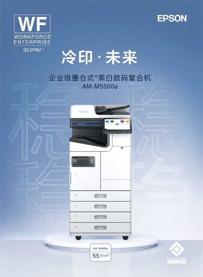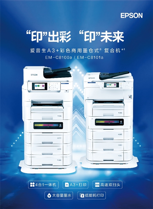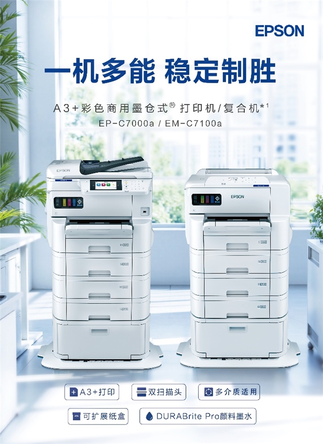 当前经济增长放缓,挑战与压力仍存,因此推进高质量发展、实现降本增效成为各行各业的行动关键。客户文印需求正从“基础功能满足”向“高效、高性价比、可持续”全面升级。作为喷墨打印技术的领军者,爱普生基于用户实际需求推出三大系列A3商用打印机新产品,包括A3+彩色商用墨仓式®复合机EM-C8100a/EM-C8101a、A3+彩色商用墨仓式®打印机EP-C7000a/复合机EM-C7100a,以及企业级墨仓式®黑白数码复合机AM-M5500a*1,进一步完善了在商用打印领域的布局。新品分别针对中小企业及垂直中高印量场景,以前沿技术迭代与细节优化,为用户提供更精准、更耐用的文印解决方案,助力用户实现降本增效 爱普生商用喷墨打印机、复合机采用Heat-free冷印技术,结构更简单,作为对比,激光复合机*2执行一次打印操作需要预加热定影器-->感光鼓充电-->激光照射-->显影-->碳粉转印-->定影六个步骤,其中还有两个步骤会产生热量,而爱普生冷印技术打印只有一步,即喷墨。冷印技术喷墨过程无需加热,能实现即开即打,令打印效率大幅提升,还可以显著降低能耗,大幅减少了对环境的影响;更为重要的是,由于打印过程更简单,零部件更少,能够帮助减少更换相应部件的频率,减少维护次数,降低维护成本。 图:激光打印*2过程与喷墨打印过程 EM-C8100a/EM-C8101a:A3彩打,破局“神机” EM-C8100a和EM-C8101a两款机器均配有“海量”墨袋,黑色墨袋印量高至86,000页*4,彩色墨袋印量高至50,000页*4,大批量连续打印不必频繁换墨,让客户更加省心,享受更轻松的打印体验。同时,结合冷印技术带来的优势,零部件更换频率低,轻松实现设备轻维护,长期使用无负担。 在扫描方面,EM-C8101a的双扫头设计让其扫描速度快至单面64页/分钟*5、双面128页/分钟*5,高效的扫描能力能大幅缩短文件处理时间、减少等待时长,给用户带来更效率的使用体验。 图:A3+彩色商用墨仓式®复合机EM-C8100a/EM-C8101a*1 当前,教育彩色化正逐步引领教育新风尚,EM-C8100a和EM-C8101a凭借高性价比的大墨袋设计,为学校用户带来革命性的彩色低成本解决方案,助力学校用户更加轻松地进行彩色打印,让彩色在教学中的应用更加广泛和深入,使教学更加生动有趣,用丰富多彩的内容点亮智慧教育。 图:DURABrite Pro高品质颜料墨水呈现本真色彩 图:EM-C8100a和EM-C8101a具有多介质适应性,在教育领域拥有广泛应用场景 EM-C8100a和EM-C8101a支持多款爱普生原厂解决方案,通过这些方案,用户可实时远程查看设备状态,维护更轻松,方案还支持打印管控、生成印量报表,助力用户进行数字化转型。在教育场景中,这可以帮助学校文印室打造更高效、更智能的印制流程。不仅如此,爱普生还与“小白智慧打印”等多家资源库进行合作,学校可以选择对应方案获取海量教辅资源,进一步为师生校园生活提供便利,促进教育行业智慧升级。 图:EM-C8100a和EM-C8101a支持多款爱普生原厂解决方案 EP-C7000a与EM-C7100a:入门级彩机,高效高性价比之选 作为爱普生A3商用产品线的入门级产品,EP-C7000a与EM-C7100a具有双面打印功能,首页输出时间快至5.5秒*6,无需等待设备预热。单面打印速度为黑白25页/分钟、彩色24页/分钟*7,双面打印速度为黑白17页/分钟、彩色16页/分钟*7,足以满足中小型企业日常所需。 图:A3+彩色商用墨仓式®复合机EM-C7100a*1(左) A3+彩色商用墨仓式®打印机EP-C7000a*1(右) 其中,EM-C7100a更是“一机多能”,集打印、复印、扫描、传真为一体,支持USB、有线网络、无线网络、无线直连连接,用户可轻松享受“一站式打印体验”。值得一提的是,该机器标配双扫描头,只需一次进纸即能同时扫描双面,扫描速度高达单面25页/分钟、双面45页/分钟*5,帮助企业用户轻松提高工作效率。5英寸触控屏*8操作更丝滑,人性化UI设计明晰易懂,还支持一键预设等高级功能,使工作流程更简单。 图:5英寸触控屏*8,升级人性化UI设计 由于采用了Heat-free冷印技术,激光打印机*2的介质局限性问题在EP-C7000a与EM-C7100a上不复存在。两款机器均具有广泛的介质适应性,可以在薄纸、皮纹纸、不干胶纸甚至是1.2米的长纸上进行输出。结合DURABrite Pro高品质颜料墨水使用,充分还原鲜艳色彩,兼具防水、耐剐蹭、速干特性,不洇墨、不掉字掉色的优异表现使文档可以得到长久保存。不仅能满足企业日常印制内部表彰奖状、会议桌卡等需求,丰富的应用场景还能为企业带来更多业务机会,省心又可靠。 图:支持多介质、多尺寸,应用更广泛 AM-M5500a:经济型高效文印,专注黑白打印 AM-M5500a是爱普生针对黑白打印需求推出的经济型高效解决方案,打印速度为55页/分钟*7,非常适合中高印量的学校、图文和工厂等客户。大容量墨仓设计成就50,000页*9的黑白印量,让用户无成本负担,畅打无压力,可应用于打印财务单据、招投标文件等场景。不仅耗材和零件所需成本低,设备还通过高稳定性降低了维护频率,成本一减再减,给用户提供更优质的使用体验,既经济又高效。 图:企业级墨仓式®黑白数码复合机AM-M5500a*1 AM-M5500a采用的是Heat-free冷印技术,得益于不接触的打印原理,AM-M5500a可打印多种材质的纸张,轻松实现一机多用,可顺畅打印薄低至52g/m2的纸张,帮助企业降低纸张成本。由于在打印过程中,不受摩擦或热量影响,不会出现类似激光机*2受感光鼓、转印带等零件磨损影响导致打印出的图像和文字模糊不清,出现黑道、底灰等问题,不同批次间也能实现稳