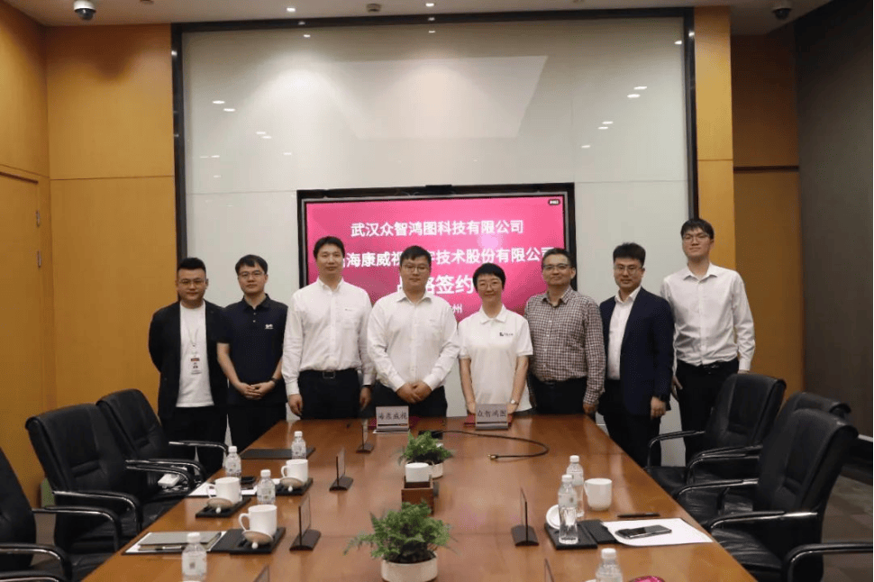 近日,武汉众智鸿图科技有限公司(以下简称“众智鸿图”)与海康威视签订战略合作协议,众智鸿图董事长曾文、海康威视湖北业务中心总裁付浩出席仪式并致辞,众智鸿图副总经理柏莉、海康威视城管市政行业总经理程佳绩代表双方签约。海康威视音频与传感产品业务部总经理高海龙、数字化产品市场总监张渔、湖北业务中心场景数字化总监刘洪杰、高级销售经理蔺良通等参加了签约仪式。