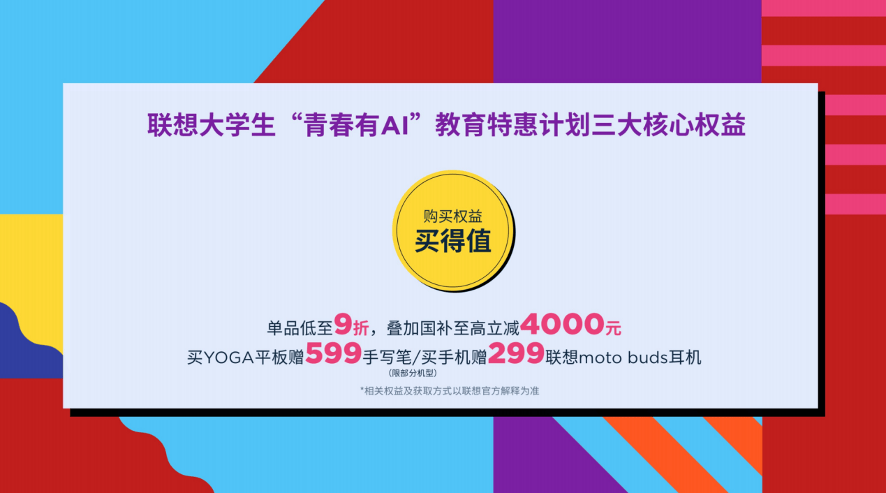 联想此前官宣的“青春有AI”教育特惠计划包含了购买、服务和成长三大核心权益,旨在为全国高校在校生及应届高考生,提供从AI设备购买、无忧换新售后到个人职业成长的全方位支持。在准大学生和大学毕业生群体中,联想通过一系列政策的推出切实地为学子们解决学业和工作上的焦虑问题。