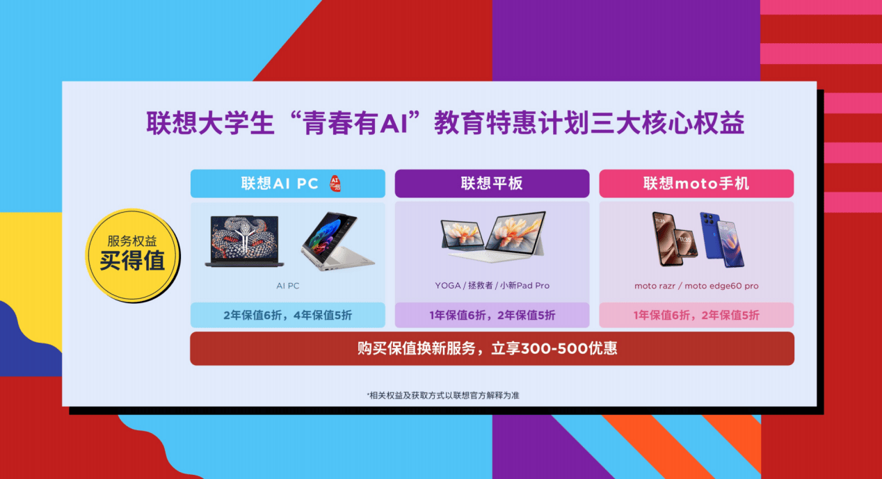 服务权益是联想为广大学子量身定制的“保值换新”服务:联想AI PC产品2年6折保值、4年5折保值;联想平板1年6折保值、2年5折保值,联想moto AI手机1年6折保值、2年5折保值。比如拯救者笔记本电脑换新服务,学生专属价直降400元,仅需399元即可享受。灵活的换新机制以及极高的保值比例,打破了3C产品一贯以来“拆箱9折、使用对折、一年骨折”的保值困境,大学生们在面临AI设备的换新周期时,联想AI终端的高保值,可以极大地减少经济负担,设备常换常新。联想把换新服务的周期最长定在了4年,部分为2年,正好符合大学生的在校时间年限,或是设备的最佳换新周期,保障了高校学子获得充沛的设备性能支持。