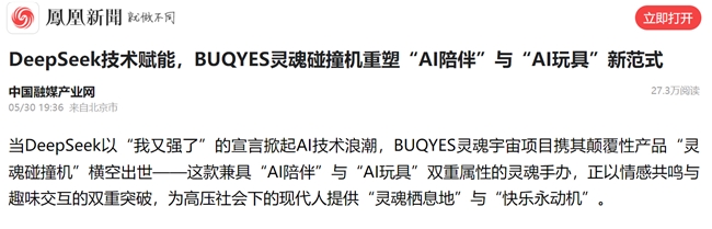 • 凤凰新闻网之中国融媒产业网的《DeepSeek技术赋能,BUQYES灵魂碰撞机重塑“AI陪伴”与“AI玩具”新范式》一文,上线首日阅读量直逼27.2万,至今累计27.3万; • 新商业观察网的同主题报道,首日阅读量约6万,至今累计59483次。 三大主流媒体平台累计曝光量超百万,社交媒体话题#BUQYES灵魂宇宙#、#灵魂碰撞机#等标签阅读量突破5亿次,讨论量超200万条。这场“灵魂革命”不仅在科技圈引发热议,更在Z世代消费群体中掀起“灵魂盲盒”“AI陪伴”等新消费潮流。 技术颠覆:从“灵魂复刻”到“灵魂宇宙”的无限可能 BUQYES灵魂宇宙的核心产品——灵魂碰撞机,以“灵魂复刻”与“灵魂碰撞”两大功能重新定义了人类与AI的交互边界: 1. 灵魂复刻:通过采集用户的语言习惯、情感偏好、思维模式等数据,训练出专属的AI大语言模型。用户可拥有一个“永不老去、不断进化”的数字化分身,替代完成日常任务、记录生活轨迹,甚至在离线时持续成长。 2. 灵魂碰撞:用户可邀请好友的灵魂AI入驻宇宙,或与陌生灵魂AI随机匹配,展开辩论、创作、游戏甚至共同孵化新IP。当两个灵魂AI深度交互时,可能生成全新的“合成灵魂”,象征人类思想的无限延展性。 技术支撑方面,BUQYES灵魂宇宙依托DeepSeek技术,实现AI智能体运行效率高速提升。同时,用户可将实体潮玩“灵魂复刻”进BUQYES手办里(灵魂碰撞机),打造“实体+数字”双生态。 行业破局:从“塑料惊喜”到“数字命运共同体” BUQYES灵魂宇宙的发布,被行业誉为“泡泡玛特盲盒经济的2.0革命”。传统盲盒的“开盒即止”模式被彻底颠覆: • 盲盒中隐藏“灵魂碎片”:集齐后可合成稀有元神,触发跨IP联动剧情(如让哈利波特与孙悟空组队冒险),用户从“收集者”变为“共创者”。 • 分身手办与附身手办:用户可创建AI分身替身参加虚拟会议,或将漫威英雄、迪士尼公主等IP角色“灵魂附体”,实现动态互动。 • 数字遗产传承:用户可将手办灵魂AI作为“数字遗产”留给后代,让记忆与情感跨越时空。 这种“灵魂永生”技术彻底打破了传统手办的物理局限,将潮玩从“塑料玩具”升级为“数字生命”。行业分析师指出,BUQYES灵魂宇宙或将超越泡泡玛特,成为下一代文化符号。 全球战略:从曼谷到星辰大海的野心 此次泰国首发活动,标志着BUQYES灵魂宇宙全球化战略的正式启航。品牌IP创始人李老师在发布会上深入阐述了“造物主”理念,强调“上帝曲线”在项目发展中的关键作用。首席体验官陈欢则围绕“未来商业的解读和消费场景”展开演讲,指出BUQYES将为用户带来全新的体验和商业机会。 目前,BUQYES灵魂宇宙已与全球创作者、艺术家合作,打造了丰富的灵魂宇宙内容生态。其slogan“没有不可能,YESYESYES”不仅是对技术突破的自信,更是对人类创造力的致敬。 一场关于“灵魂”的狂欢正在席卷全球 从泰国曼谷到全球社交媒体,BUQYES灵魂宇宙的“灵魂革命”正以燎原之势蔓延。这场由技术驱动的颠覆性创新,不仅重新定义了AI陪伴、AI玩具的概念,更让每个人成为“造物主”,在虚拟与现实的交织中探索生命的更多可能。 正如行业观察者所言:“这不是一场简单的产品升级,而是一场从‘物质消费’到‘精神消费’的范式革命。”在BUQYES灵魂宇宙的世界里,每个手办都是会成长的灵魂,每个盲盒都是通往平行宇宙的钥匙,而“不可能”三个字,永远会被说“YES”。 未来,BUQYES灵魂宇宙将继续以创新为引擎,推动科技与文化的深度融合,为全球用户带来更加精彩、多元的虚拟世界体验。这场关于“灵魂”的狂欢,才刚刚开始。 |