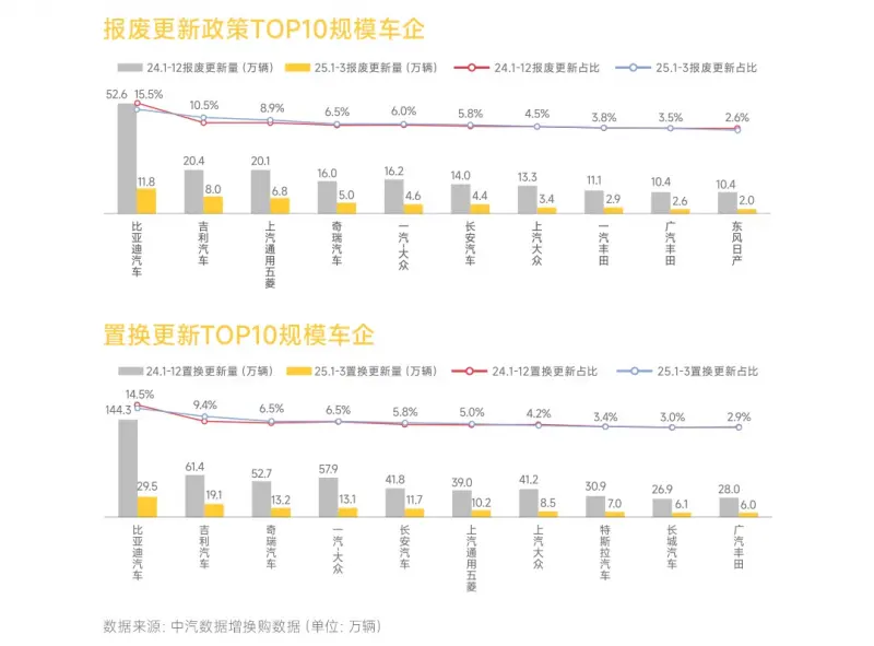 消费结构升级:新能源车型受青睐,置换更新用户升级明显 置换更新与报废更新用户特征也表现出明显不同。《报告》分析指出:报废更新用户通常对价格更敏感,置换更新用户则表现出明显的“升级”特征,懂车帝调研数据显示,超50%置换用户更倾向20-50万元的中高档车型。从级别角度看,自2024年补贴政策实施以来,置换更新市场中B级车市场单月占比从不足40%提升至42%以上,以旧换新政策有效带动了车市消费的“品质跃迁”。 通过补贴力度倾斜,以旧换新也加快了新能源市场的渗透。数据显示,补贴政策出台后国内乘用车市场新能源车单月渗透率从不足40%迅速提升至50%以上。中汽数据预测,2025年乘用车市场中单月新能源渗透率有望突破60%,全年有望超55%。 分车企来看,在新能源产品上具备优势的企业更受消费者青睐。无论报废更新或置换更新,均体现出这一特征。