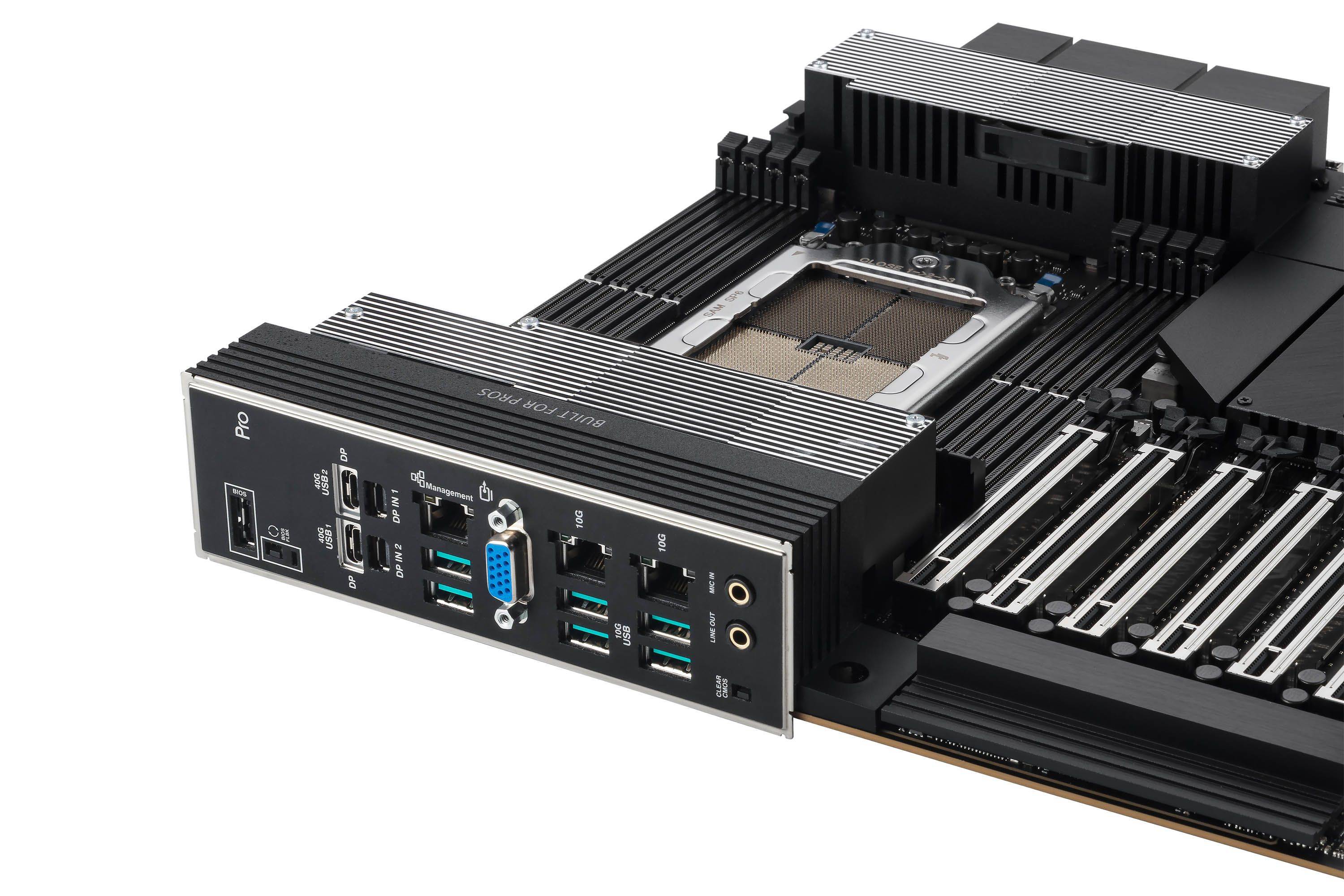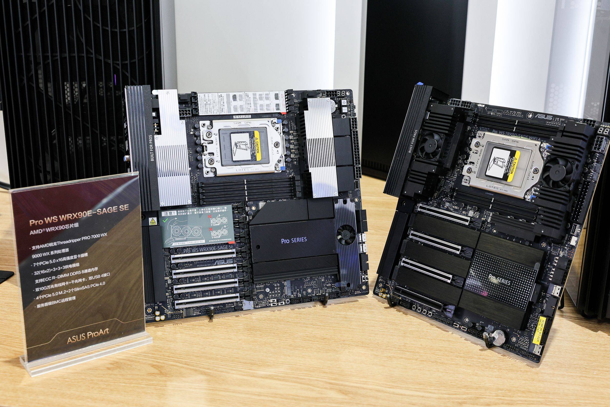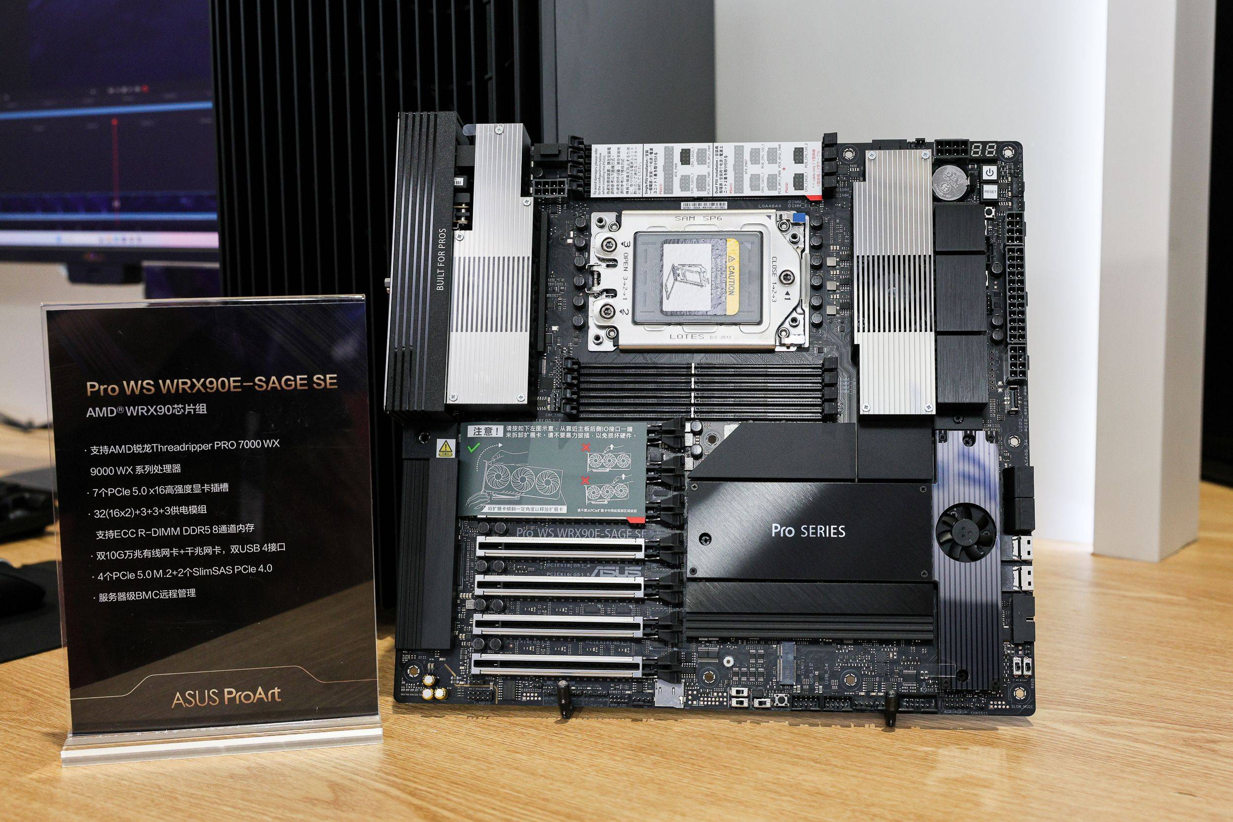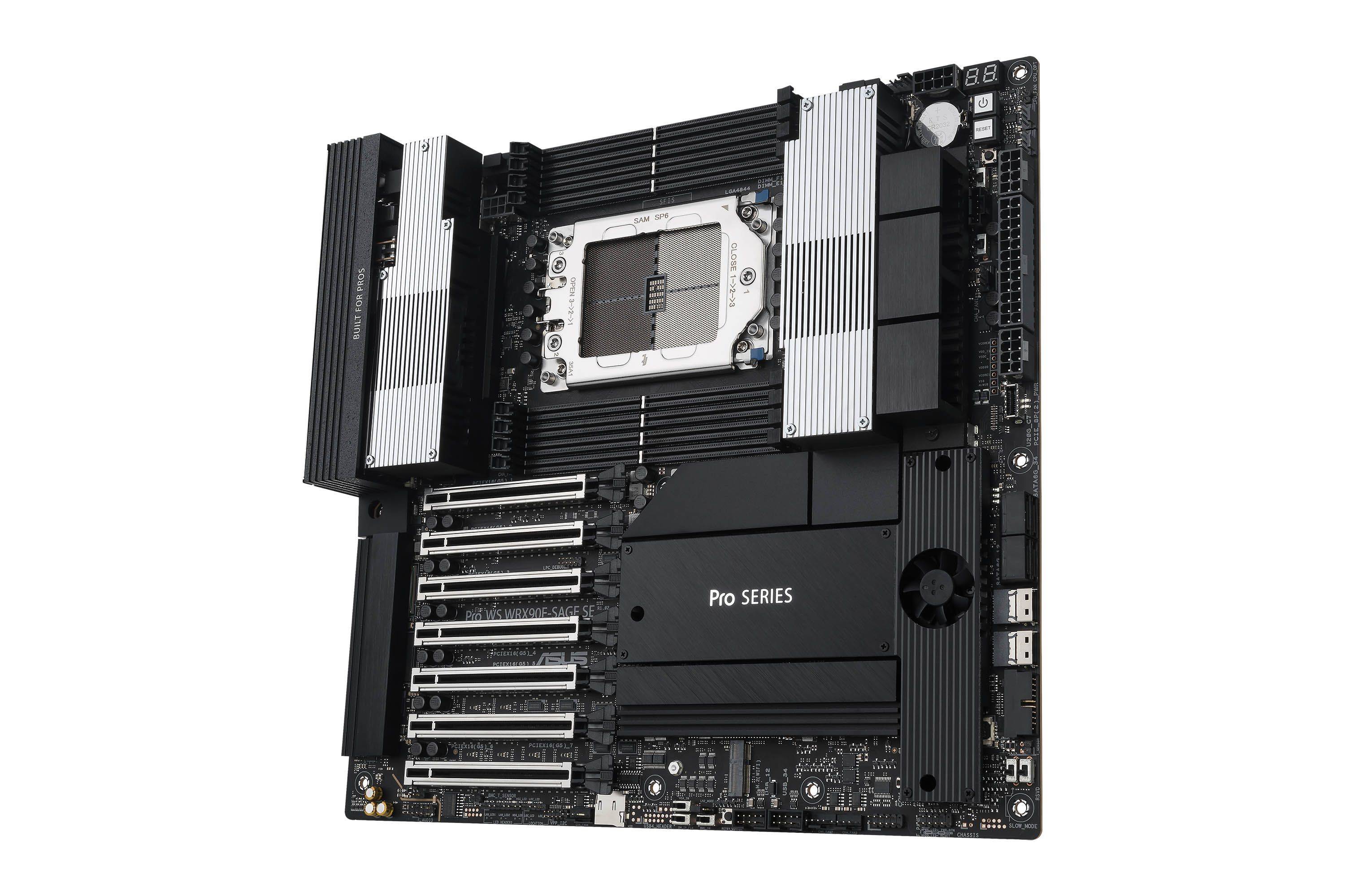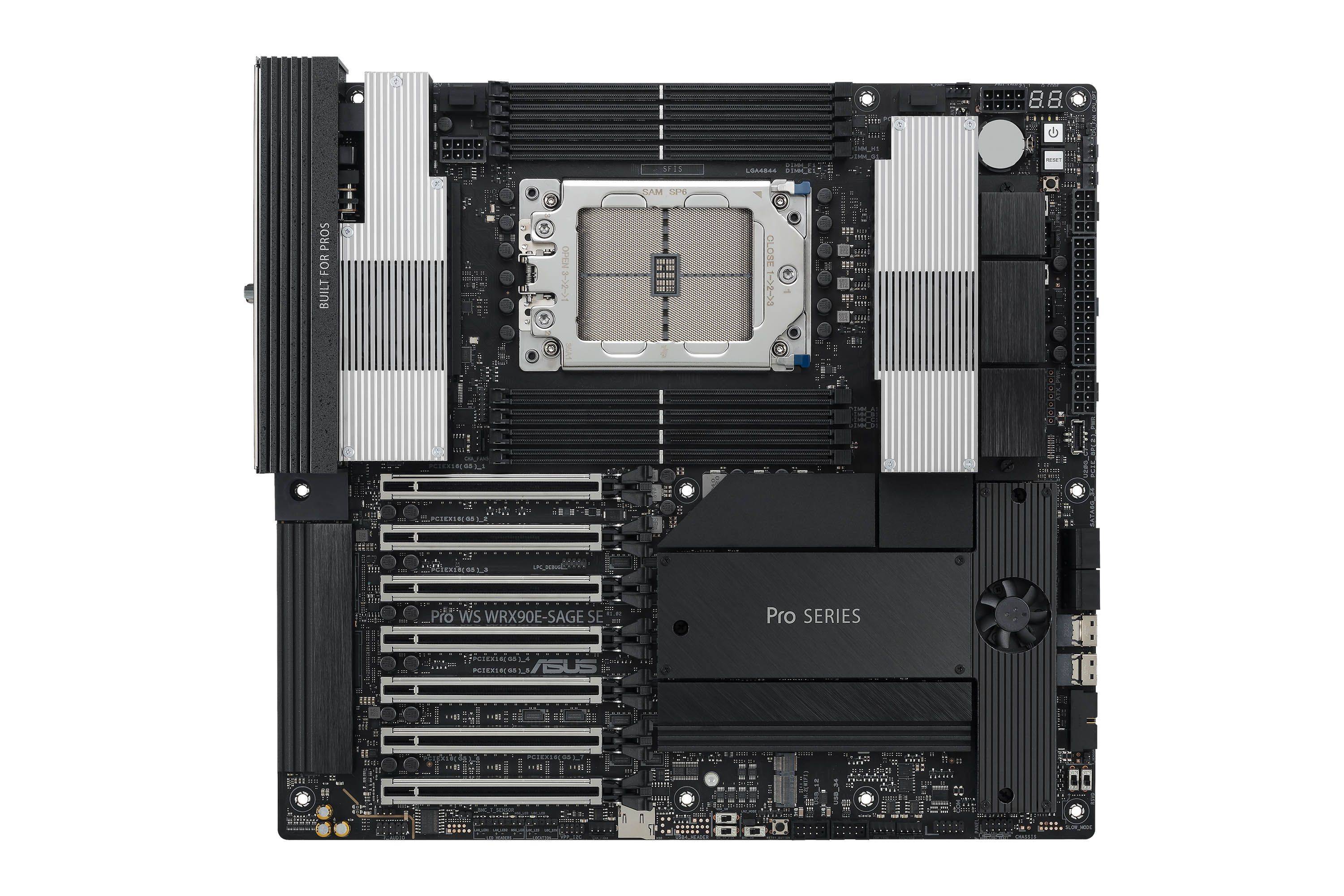 华硕Pro WS WRX90E-SAGE SE主板专为AI人工智能、深度学习、影视动画创作、3D渲染等专业用户量身打造。支持超强算力和高速数据传输,不论是多显卡协同作业,还是拓展内存、疾速互联都游刃有余,轻松驾驭模拟、渲染、AI运算等高负载工作。主板突破性地配备了(16×2)+3+3+3供电模组,加上外包裹金属层的ProCool II高强度供电接口,可充分释放AMD锐龙Threadripper PRO 9000WX系列处理器潜力。拥有8个DDR5内存插槽,最高支持2TB ECC R-DIMM DDR5内存,通过优化的内存布线设计,大幅提高内存超频空间及稳定性,从来带来更好的内存性能表现。