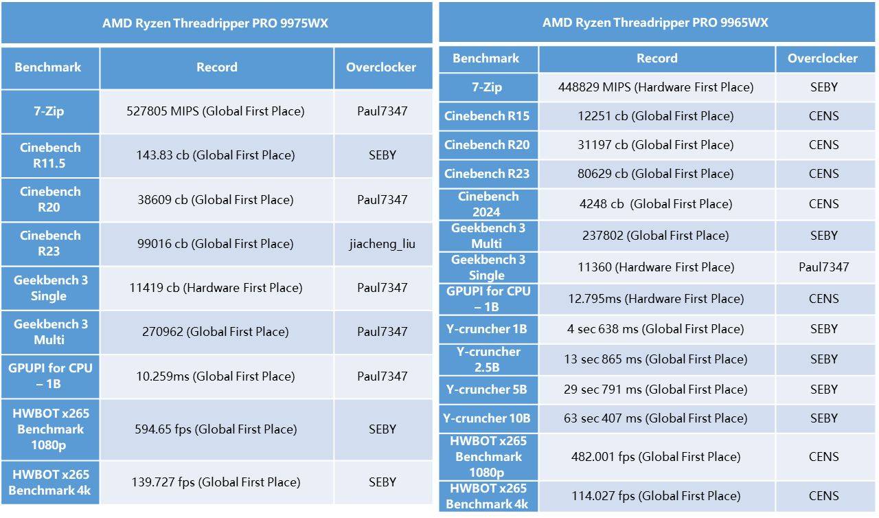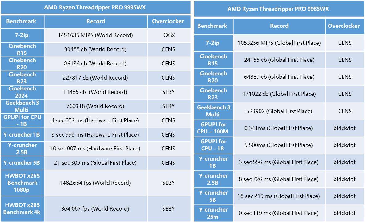 AMD锐龙Threadripper PRO 9995WX处理器是CPU领域的新王者,配备行业领先的96核心192线程以及高达5.4GHz的加速频率,在复杂仿真、生成式设计、渲染、AI推理及软件编译任务中可充分释放其澎湃算力。专业超频发烧友CENS和SEBY使用华硕Pro WS WRX90E-SAGE SE主板,在极限状态下精准控制,将这颗处理器的性能发挥到了极致,最终斩获了大量纪录。尤其值得一提的是HWBOT x265 Benchmark 4K测试成绩:SEBY打破了他自己此前同样使用Pro WS WRX90E-SAGE SE主板创造的世界纪录,提升幅度达到了惊人的20%。