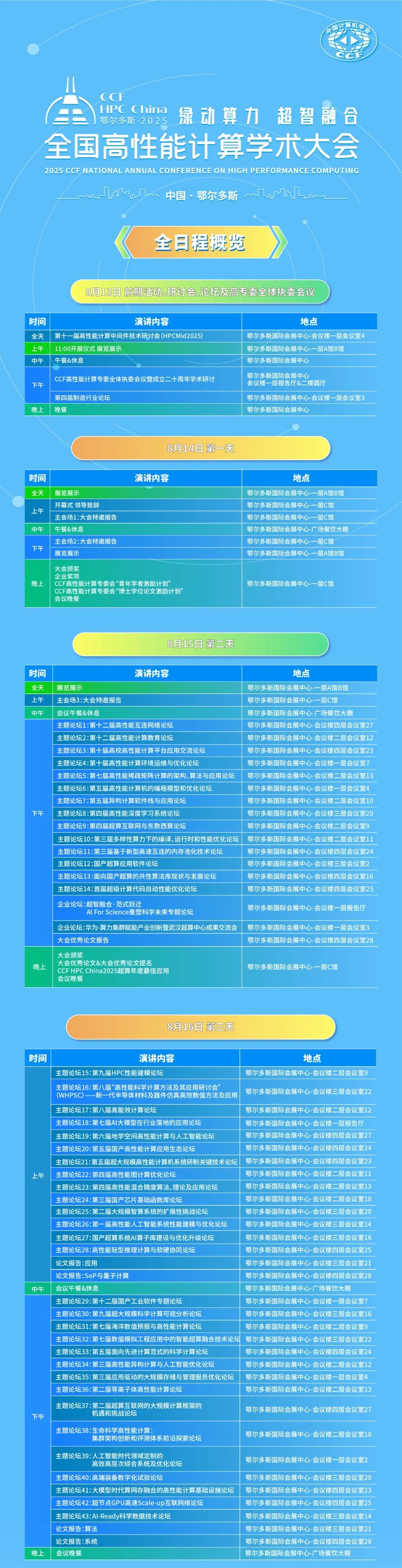 第21届CCF全国高性能计算学术大会(CCF HPC China 2025)定于8月13-16日在鄂尔多斯国际会展中心举办。作为全球三大超算盛会之一,本届大会以"绿动算力 超智融合"为主题,延续"学术引领、产业融合"特色,联动发布WEC 2025算力产业全景图,构建集技术研讨、成果展示、生态对接于一体的高性能计算交流平台。以下为您呈现大会核心亮点与实用信息,助力高效参会。 学术与产业共振,超算生态全景呈现 从顶尖学术碰撞到全产业链成果亮相,再到生态资源的精准对接,这些内容将为您揭示本次超算盛宴的核心吸引力。本届大会三大亮点值得关注: - 顶尖学术阵容集结:汇聚20+大会特邀嘉宾、40+高质量主题论坛及500+报告嘉宾,涵盖图灵奖获得者、中外院士等各界专家,聚焦高性能计算在多领域的前沿突破。 - 全产业链成果展示:近百家全球算力领域头部企业参展,全面呈现芯片、超算中心等全链条技术成果,华为、曙光等企业将展示落地案例,同步开展"超算年度最佳应用"评选。 - 生态资源协同对接:同期发布WEC 2025算力产业全景图,覆盖数十个细分领域生态图谱并提供免费入驻通道,助力参会者实现全产业链企业对接与合作。 CCF HPC China 2025不仅是超算技术的交流高地,更是算力生态的聚合平台。无论您是科研工作者、企业技术人员还是投资机构,都能在这里找到前沿趋势、合作商机与生态伙伴。8月鄂尔多斯,让我们共赴这场高性能计算的年度盛宴,见证超算驱动产业变革的新未来! 大会4天详细日程,亮点场次抢先看 本届大会历时四天,以下为您具体介绍大会的时间框架与展区布局,帮助您提前做好参会计划,合理规划日程。 *日程仅供参考,最新完整日程请以大会官网为准 超大型展区信息,快速一览 本次大会邀请了60余家企业现场参展,位于鄂尔多斯国际会展中心A\B馆内,凭大会证件可进入展区观展;如仅参与展区活动,可前往https://ccf.org.cn/wec2025限时免费注册。 #REMINDER# 如何注册参会? 确定参会行程后,完成注册与签到是入场参会的必要环节。下述报名流程、票种权益及签到细节,确保您顺利入场。 ※付费票种权益 包含资料礼品包、会期午餐&晚宴券、入场证件等几种或全部。 报名方式扫码登录大会官网: https://ccf.org.cn/hpcchina2025, 点击报名→完善信息→选择票种→完成付款→报名成功。 签到时间(现场报名时间) 2025年08月13日09:00-20:00 2025年08月14日07:30-18:00 2025年08月15日08:30-18:00 2025年08月16日08:30-17:00 签到地址 内蒙古自治区·鄂尔多斯国际会展中心 签到处 签到方法 注册成功后,凭电子票二维码或手机号至大会签到台核验身份,领取资料,完成签到。 电子票二维码获取方式1打开CCFlink APP→个人中心→找到会议→点击“签到”→出示二维码签到; 电子票二维码获取方式2扫码登录CCF会议系统→点击下方“报名”→ 点击右上角“我的报名”→找到会议→点击“签到码”; 出行指南 扫描下方二维码预定协议酒店及摆渡车。 01 交通指南 ·由于暑期去往鄂尔多斯的机票紧张,请尽量提前预定机票、高铁、酒店。 ·8月13日,大会将安排摆渡车接送嘉宾,涉及会场(鄂尔多斯国际会展中心)、机场(鄂尔多斯伊金霍洛国际机场)、高铁站(鄂尔多斯站)、协议酒店等(发车时间以小程序公布为准)。 ·8月14-16日,早晚将安排摆渡车接驳嘉宾往返会场及协议酒店(每日发车时间以小程序公布为准)。 ·自驾可停至鄂尔多斯国际会展中心临时停车场。 02 住宿安排 ·鄂尔多斯会议酒店可通过上方小程序进行预定,预定前请仔细阅读“付款说明”谢谢! ·预定时,请确认是否选择在2025年8月10-17日区间,以免您看不到可用的房型。 03 餐饮安排 ·组委会邀请的嘉宾及报告讲者,已注册缴费的嘉宾等在签到注册时均会领取8月14-16日3天中午及晚间的餐券,可凭餐券到指定餐厅用餐。 ·大会现场设置了鄂尔多斯特色美食区,参会嘉宾亦可前往品尝——鄂尔多斯美食市集将草原饮食文化具象呈现。现烤羊肉串、肉肠,传承牧民对食材本味的执着;酿皮、碗托等手作美食,藏着街头烟火记忆;手工羊肉面、鲜果饮,既有家常温度又有自然本味。当超算盛会的科技交流暂歇,不妨漫步市集,从舌尖触摸鄂尔多斯人文脉络,把草原饮食里的生活哲学,留存心田。 大会合作伙伴鸣谢单位 #REMINDER# |