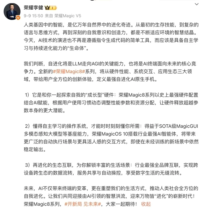 【科技快报网】10月9日,荣耀官宣将于10月15日在北京举办荣耀Magic8系列暨MagicOS 10发布会,届时荣耀Magic8标准版与荣耀Magic8 Pro版两款机型将正式亮相。其中“AI自进化”与“2亿超夜神”成为业界及用户的两大关注焦点。依托在AI领域的长期技术积累和对消费者需求的敏锐洞察,荣耀Magic8系列在硬件性能、系统交互、应用生态三大领域,带给消费者全方位的创新体验,定义了首款自进化AI原生手机。 AI时代,用户对手机的期待早已超越传统的性能参数,而是更加注重智能化、个性化的交互体验。作为首批搭载第五代骁龙8至尊版的旗舰机型,最新版操作系统MagicOS 10搭载的YOYO智能体,达到了中国信通院权威认证的L3卓越级水平,代表了当前智能体泛化能力的最高水平。 荣耀CEO李健此前表示,荣耀Magic8系列通过AI赋能硬件与软件的深度结合,让AI以“原生”方式重构产品价值。荣耀智能体YOYO更像一位个性化助理,随着用户的使用不断迭代,越来越懂用户的需求。这种自进化能力,使得荣耀Magic8系列不仅仅是一部手机,更是一位能够不断学习、不断进步的智慧伙伴。 为进一步释放AI交互能力,更便捷、高效地开启智能生活,荣耀Magic8系列在机身侧边新增了专属AI物理按键,可以一键触发AI相关应用,为用户提供了与YOYO交互的全新入口。 影像方面,荣耀Magic8系列同样充满惊喜。荣耀Magic8 Pro搭载了2亿像素超清潜望长焦,最大100倍数字变焦,远近皆清晰,2亿超夜神。据此前曝光的夜景样张来看,影像升级成为本次Magic8系列的一大惊喜。 外观设计一直是荣耀手机的核心亮点之一。荣耀Magic8系列延续了整体简约、细节精致的现代美学理念,在屏幕形态、材质工艺和色彩叙事上进行了创新演绎。荣耀Magic8全系采用四窄边框与大R角直屏相结合的外观设计,标准版搭载6.58英寸1.5K OLED直屏,以1.2mm的业界极窄边框营造出更具沉浸感的视觉体验;荣耀Magic8 Pro采用6.71英寸1.5K等深四微曲屏,巧妙融合了曲屏的温润手感与直屏的开阔视野,进一步诠释了科技与美学的平衡之道。 AI技术的演进,不仅带来终端的变革,更推动人类社会全方位的自我进化。即将发布的荣耀Magic8系列,从外观设计到硬件性能,从影像到AI交互,彰显着荣耀对于极致体验的追求,以及其在AI领域的深厚积累与前瞻视野。10月15日,一起期待荣耀Magic8系列开启AI终端新范式,见证硬核科技与美好生活的完美融合。 |