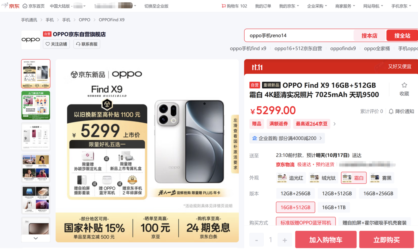 10月16日,OPPO Find X9系列正式发布,售价4399元,将于10月22日正式开售。为带给消费者更多权益,京东携手OPPO打造先人一步加速换新计划,下单OPPO Find X9系列16GB+512GB版享限量现货优先发货,最快当日达,先人一步下单还能限量加赠京东PLUS会员京典年卡。京东11.11火热进行中,来京东下单OPPO Find X9系列还可享权益随心选,包括限量孙颖莎限定礼盒、限量新品上市专属礼盒、自拍屏摄影套装、OPPO蓝牙耳机、京东手机2年碎屏保,五项权益可任选其一。目前,京东已同步开启OPPO Find X9系列预售,部分地区享国补到手价3899元起,参与预售还可享至高24期免息、以旧换新至高补贴1100元、晒单至高赢100元京豆、赠新机权益礼包、iOS转服红包(至高99元现金红包)等福利。