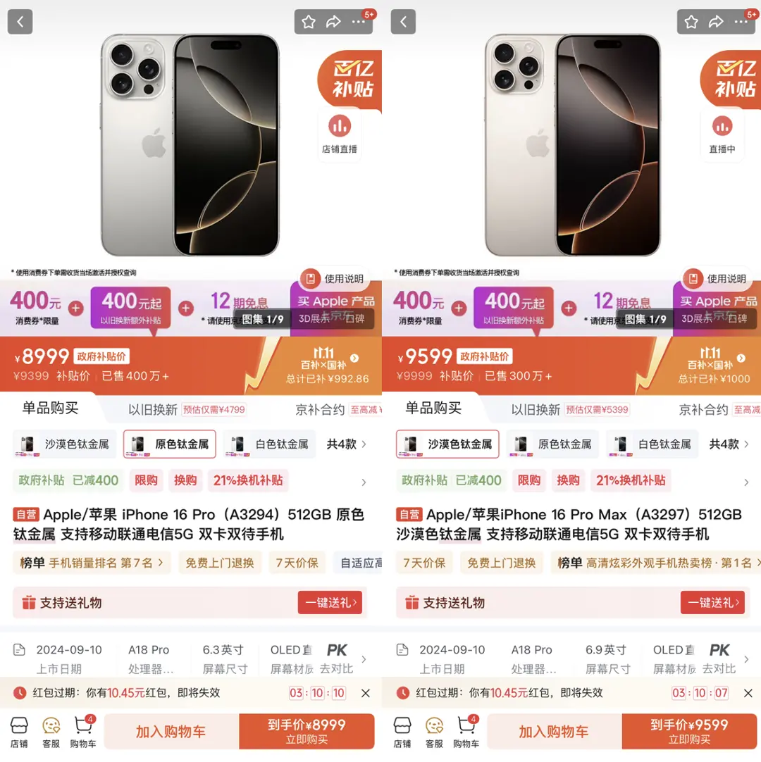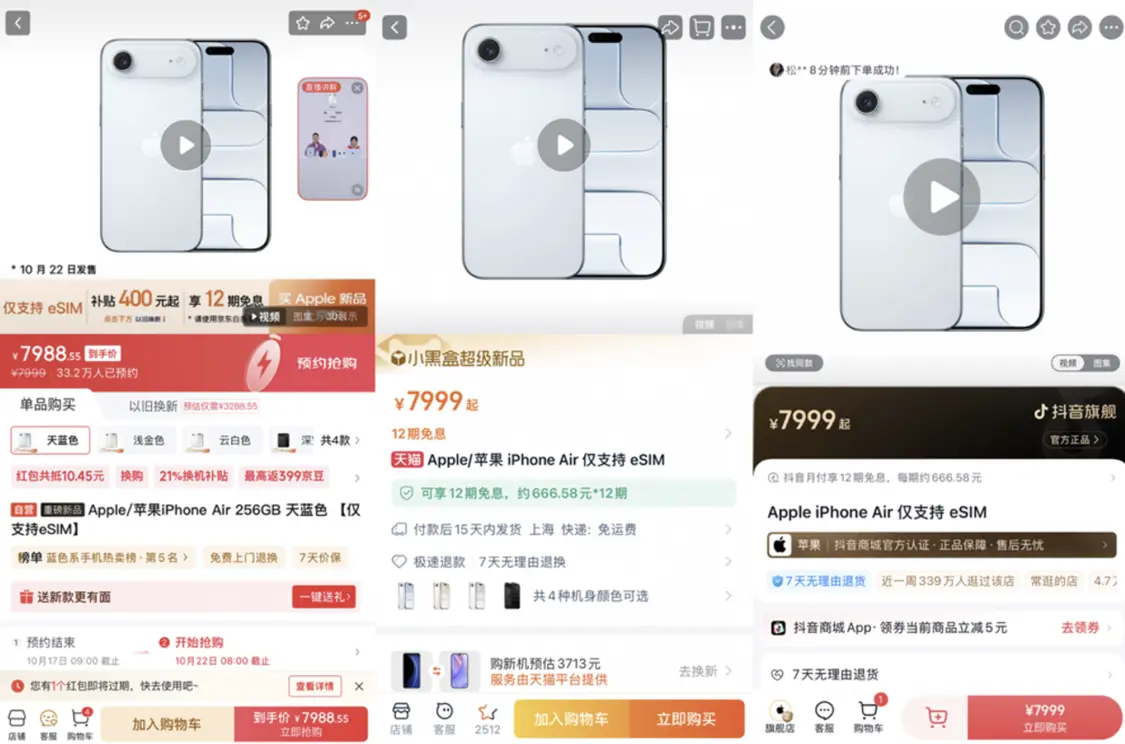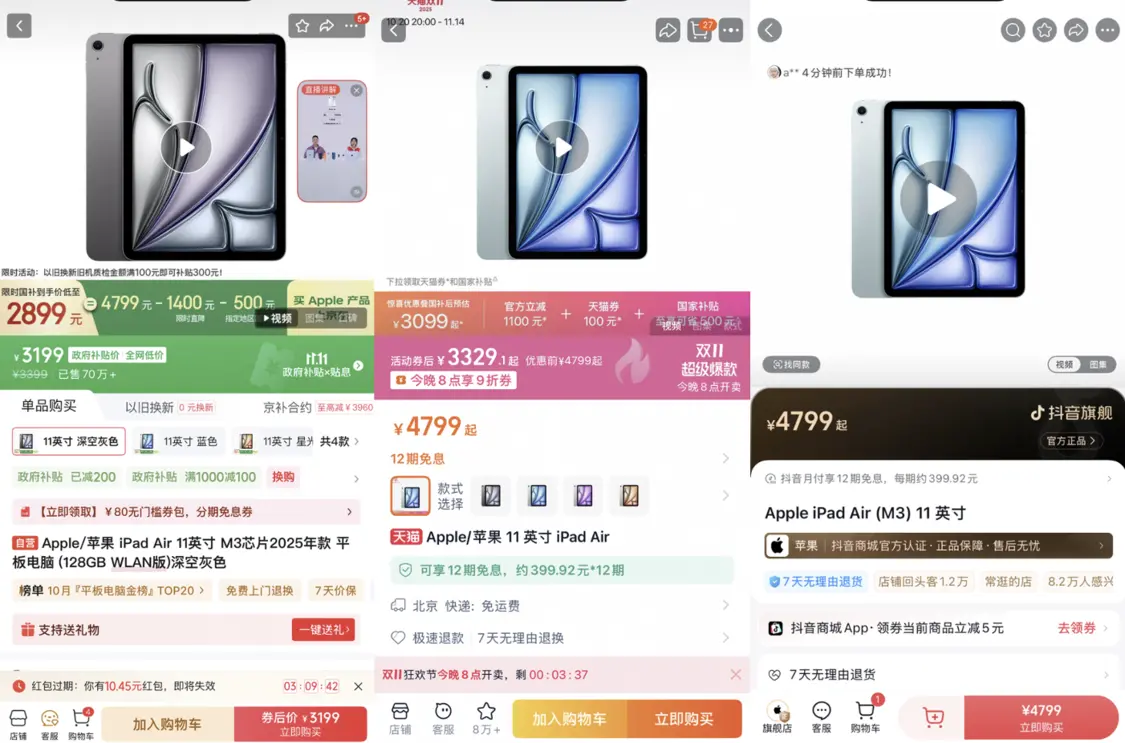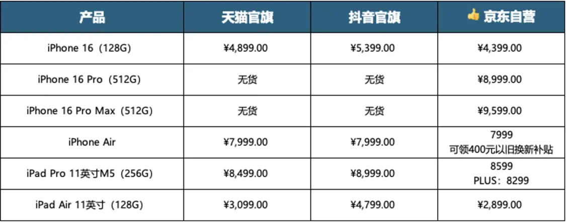 双11正在火热进行中,想低价入手Apple产品的都在哪里下单了?不管是iPhone 17系列,还是新上线的iPad、Mac新品,各大平台均推出了自身优惠。也有网友对比了天猫、抖音、拼多多以及京东的各项优惠,在考虑国家补贴、正品、配送等因素下,建议大家选择京东下单。 iPhone Air目前正在各大平台预售,10月22日正式开售。天猫和抖音官旗目前价格都是7999元起,并无任何优惠,但京东可领400元换新补贴,整体算下来能便宜400元。iPhone 17系列,天猫可叠加300元惊喜券,抖音并无任何优惠,京东可在300元惊喜券基础上再叠加PLUS优惠,还能再便宜几十不等。 但由于iPhone 17系列货量有限,抢不到的可能性更大,所以大部分用户会选择iPhone 16系列。128G版iPhone 16,抖音官旗到手价是5399元,天猫官旗可使用国家补贴到手4899元,但京东可以领取800元消费券,到手只需4399元。而且iPhone 16 Pro、iPhone 16 Pro Max在天猫、抖音都没上线,京东可以领取400元消费券,还可叠加400元换新补贴,512G版到手低至8999元、9599元。 iPad Pro 11英寸M5(256G)虽然是新上的品,天猫可使用500元消费券到手价是8499元,抖音没有优惠到手价8999元,但京东可领400元消费券,PLUS会员还能叠加300元的专属券,最终到手只需要8299元,足足比抖音官旗便宜了700元。另外iPad Air 11英寸(128G)也有大几百的价差,天猫官方立减1100元,还可叠加100元天猫券以及至高500元国家补贴,最终到手价是3099元起,抖音官旗并无优惠到手还是4799元,京东则直降1400元,再加上500元国家补贴,最终到手只需2899元,比天猫还便宜200元。 除了正品平台外,在京东购买Apple Watch S11,最终到手价比拼多多还便宜。以GPS款42mm为例,京东和拼多多的价格虽然都是2499元,但京东支持以旧换新和国家补贴,拼多多并不能享受该福利,整体算下来还是京东便宜。 看到这里,大家都知道哪里买更合适了吗?而且在京东加购iCloud还可享85折,担心花大价钱买的iPhone 17碎屏,还可以加购碎屏电池保,只需一次投入就能享无限次前屏维修。另外在京东买iPhone 17系列还能抢2100元以旧换新券,抢到就是赚到! 免责声明:市场有风险,选择需谨慎!此文仅供参考,不作买卖依据。 |