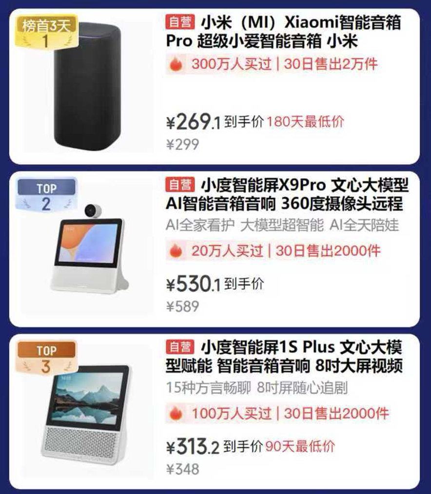 打造智能生活,从选对音箱开始!AI音箱11.11热卖榜给你的家增添智能交互。榜首小米智能音箱Pro成为300万人的首选,30日售出2万件,当前最低价269.1元;深受20万人青睐的小度智能屏X9Pro最适合有娃家庭,30日售出2千件,530.1元享360度远程看护与大模型陪聊;喜欢追剧娱乐和方言互动?小度智能屏1S Plus很适配,100万人入手同款,30日售2千件,90天最低价仅313.2元。