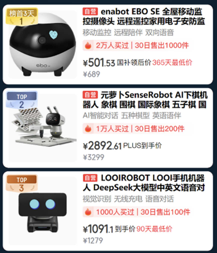解决了基础交互,AI机器人11.11热卖榜单帮你把居家安全与趣味陪伴也跟上。enabot EBO SE全屋移动监控摄像头作为榜首产品,已成为2万人首选,30日售1千件,国补领后到手价501.53元,购入即享亲友之间的远程陪伴;榜单第二名——元萝卜AI下棋机器人,支持五种棋型与AI对话,30日销量达200件,PLUS到手价2892.61元;科技控别错过这件千人选购的LOOI手机机器人,90天最低价1091.1元,DeepSeek大模型语音对话与无线充电帮你生活更智能。