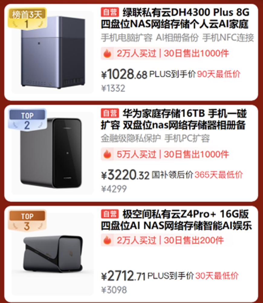 除了日常使用的好物,保障数据存储安全的产品也是很多人的刚需,AI家庭存储11.11热卖榜已经准备好了选购指南。位居榜首3日的绿联私有云DH4300 Plus已有2万人选择,30日即售千件,PLUS价1028.68元;追求隐私保护,5万人青睐的华为家庭存储16TB正合适,国补领后到手价3220.32元;科技爱好者可选极空间私有云Z4Pro+,PLUS价2712.71元,与2万购入者享同款智能AI娱乐存储。