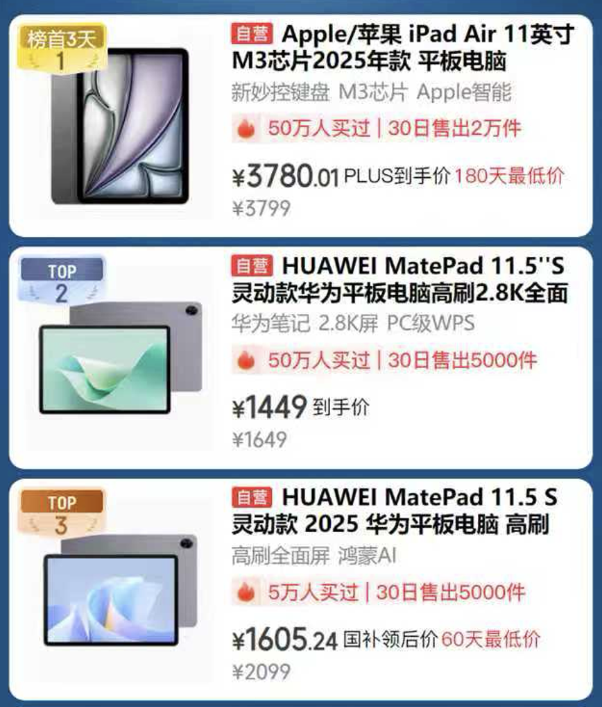 居家使用之外还想提升个人学习与办公效率?不妨从AI平板11.11热卖榜挑选好设备。创意工作者可选iPad Air 11英寸M3芯片2025年款,作为50万人买过、30日售2万件的榜首产品,180天最低价仅3780.01元;同样50万人选购的华为MatePad 11.5'' S灵动款,平台补贴价1449元,2.8K屏带来极致体验;5万人买过的华为MatePad 11.5 S灵动款同样值得选购,30日已售5千件,国补领后到手价60天最低价1605.24元助力高效办公。