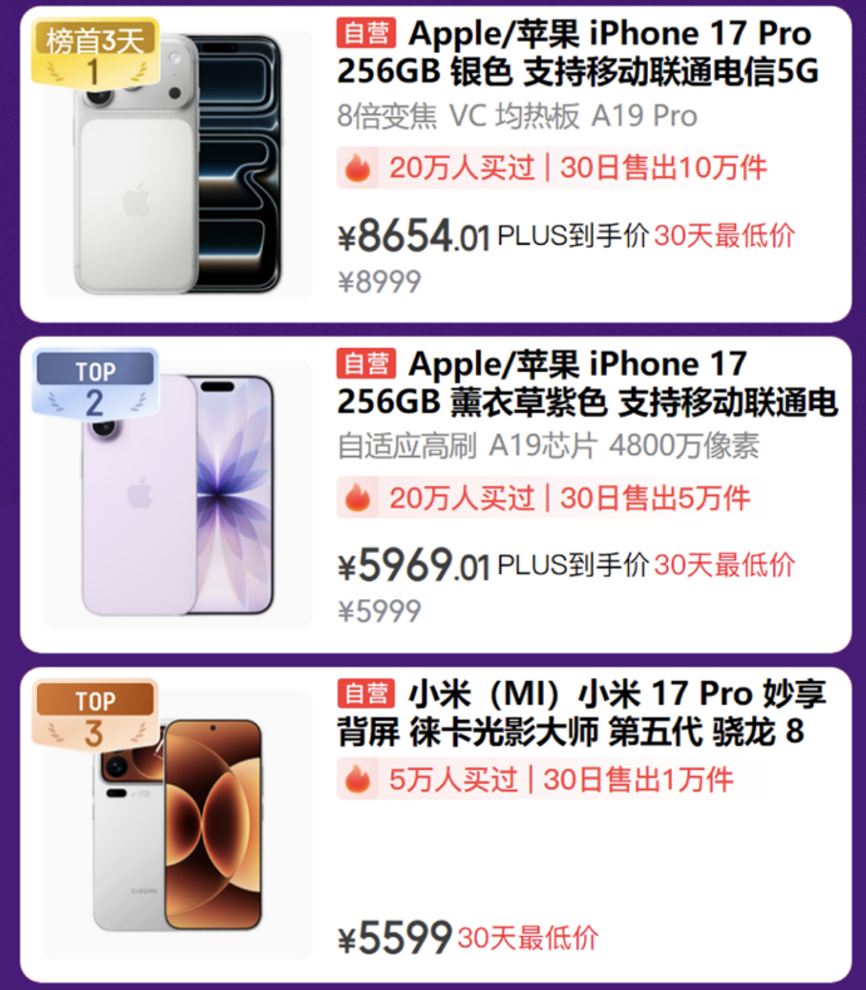 作为办公娱乐都离不开的核心设备,手机的选择自然更要精细,AI手机11.11热卖榜帮你选出3款优质产品。高端旗舰产品——iPhone 17 Pro 256GB银色款,20万人已入手同款,30日售出10万件,PLUS到手价8654.01元,30天最低价享受8倍变焦带来的极致摄影体验;还有iPhone 17 256GB薰衣草紫色款,PLUS价5969.01元,A19芯片与4800万像素最贴近日常拍照;不要忘记这款5万人选择的小米17 Pro,30日最低价5599元售出1万件。