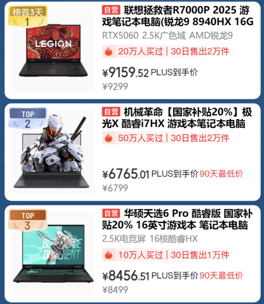 相较于手机,性能强劲的游戏本对游戏玩家来说更是关键装备,AI电脑11.11热卖榜已经准备好了你的购买助力。获得20万人青睐的联想拯救者R7000P 2025游戏笔记本电脑作为榜首产品,30日狂销2万件,PLUS到手仅9159.52元;还有机械革命极光X 酷睿i7HX游戏本笔记本电脑,50万人选择后30日即售2万件,国补领后PLUS价仅6765.01元,享90天最低价;喜欢颜值性能双在线,30日售万件的华硕天选6 Pro酷睿版笔记本电脑就很好,10万人的共同选择,国补后8456.51元即可入手。