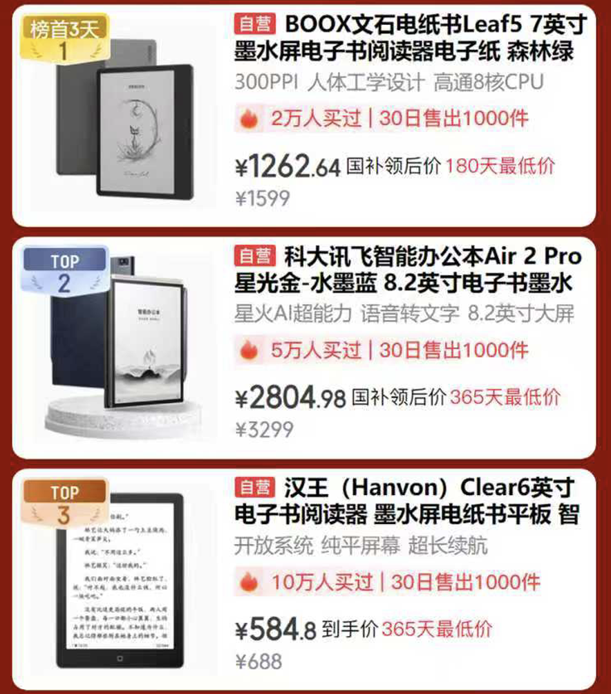 除了电子游戏,电纸阅读也是休闲娱乐的好方式,AI电纸书11.11热卖榜让你不再发愁阅读工具。通勤阅读爱好者,榜首产品BOOX文石电纸书Leaf5森绿款正合适,国补领后到手价1262.64元,享受7英寸墨水屏带来的阅读体验;商务人士可选科大讯飞智能办公本Air 2 Pro,8.2英寸屏,支持分屏手写,30日已售千件,365天最低价享国补,低至5204.98元;学生党选汉王Clear6英寸电子书阅读器,30日售千件,到手价674.8元即可体验超长续航。