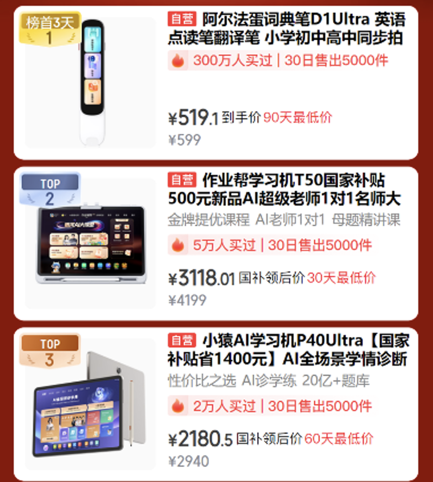 满足自己生活需求之后,还发愁孩子的学习设备?AI学习硬件11.11热卖榜这就帮你处理难题!英语学习遇瓶颈可以选择有300万人都在使用的阿尔法蛋词典笔D1Ultra,30日售5千件,花519.1元即可用点读解决翻译问题;想请“AI私教”有作业帮学习机T50,30日销量5千件,5万人已经入手,国补领后到手价3118.01元还享1对1名师提优;还有小猿AI学习机P40Ultra,30日售5千件,国补领后到手价2180.5元。