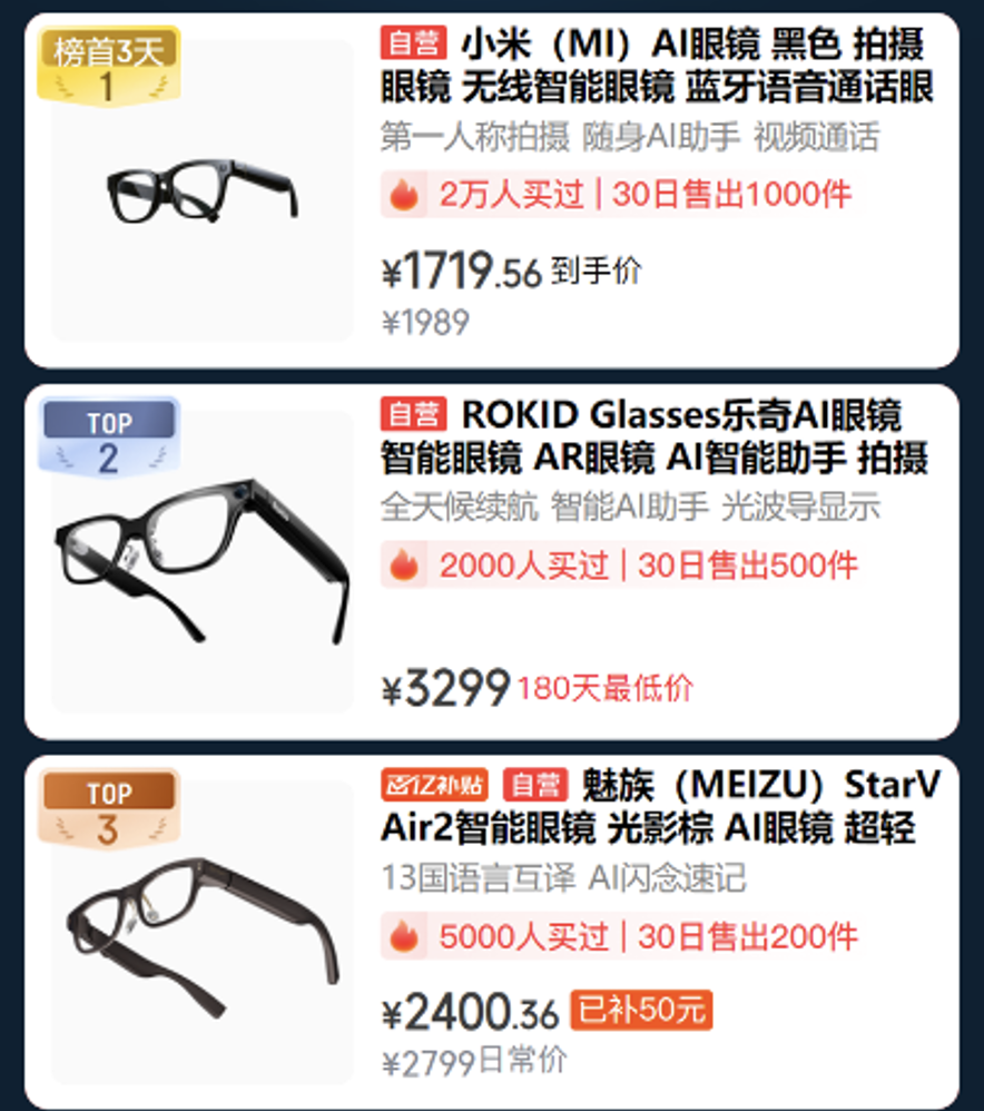 最后还有AI眼镜11.11热卖榜为科技潮人准备的新奇体验:想要日常智能辅助?2万人选择的小米AI眼镜黑色款最合适,蓝牙语音、视频通话都不是问题,30日售千件位居榜首,到手价1719.56元;追求高端AR体验?那就选2千人都在用的乐奇AI眼镜,30日销量500件,3299元享光波导显示与全天候续航;经常跨国旅行?让魅族StarVAir2智能眼镜帮你互译13国语言,30日售200件,补贴50元后2400.36元就能入手。