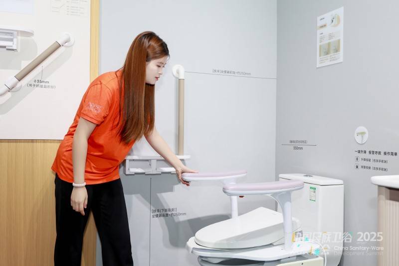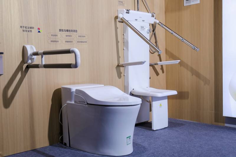 “和玥”空间 盥洗区配备挂墙升降浴室柜,采用可调节无障碍设计,适配坐姿或轮椅使用者,前置挥手感应去水器,兼顾实用与便捷;如厕区,安全辅助扶手以亲肤材质消除冰冷感,一体成型增强抓握力,并搭载紧急报警按钮,提升应急能力;淋浴区的人体工学淋浴椅,以加宽座椅缓解站立疲劳,支持收纳功能确保空间灵活性 更引人注目的是,箭牌还推出了国内首个采用湿法尿液检测法的P9尿检智能坐便器,让用户在家即可自检尿糖、尿蛋白、尿比重等六项尿检指标,3分钟内输出结果,并通过App组建家庭组数据共享,实时共享家人检测数据,方便子女远程关注老人健康。在卫浴行业里,箭牌P9尿检检测智能坐便器的健康功能,已具备明显的排他性和竞争优势。