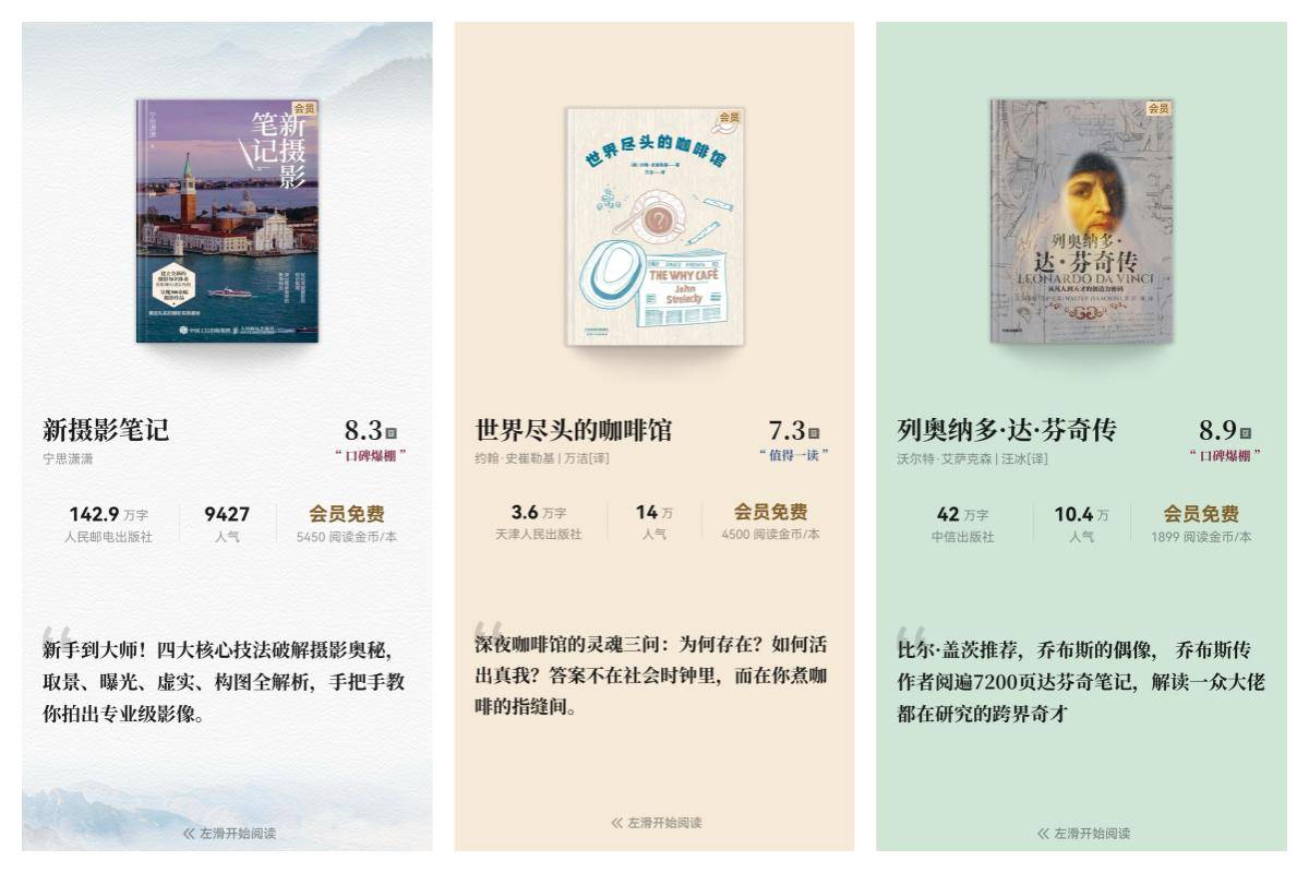 后续即将阅读的书籍,读者们也可以关注。《新摄影笔记》从作者的亲身拍摄经验,创造出一套摄影教程体系,深入浅出,容易理解,非常适合摄影初学者和摄影爱好者学习。《世界尽头的咖啡馆》则从充满哲思的角度,发出深夜咖啡馆的灵魂三问,答案不在社会时钟里,而在每一个读者的煮咖啡间隙里。《列奥纳多·达·芬奇传》更是众多名人推崇的人物传记。这些书籍都是华为阅读VIP会员免费阅读书籍,非常适合与同好共读和探讨,华为阅读为读者搭建了这样以书会友的平台,邀请对这些书籍感兴趣的会员报名参加。