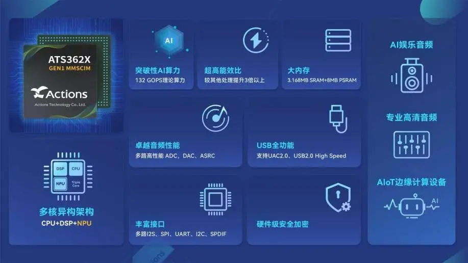 当前人工智能(Artificial Intelligence,AI)热浪滔天,智能设备正从“被动响应”迈向“主动感知”,AI将成为连接物理世界与数字世界的核心枢纽,更是被预测为未来重要的基础建设之一。一个具备全球视野的专业音频芯片品牌——炬芯科技,深耕音频领域二十余载,始终站在技术演进的前沿,以深厚的技术积淀和前瞻性的战略布局,积极拥抱AI时代。如今,炬芯科技凭借全面升级的端侧AI芯片平台在音频领域率先实现突破,推动听觉体验迈入新纪元,并以此为基石,承载起面向万亿级AIoT市场的海量应用想象。 深耕音频技术,二十年磨一剑 音频技术,是炬芯科技的核心基因,也是二十多年来始终如一深耕的核心领域。从数字多媒体时代的高品质音频编解码,到IoT时代蓝牙音频无线互联,再到 AI时代端侧AI音频智能交互,炬芯科技始终致力于打造低功耗、低延迟、高音质的智能无线音频芯片解决方案。在这一历程中,炬芯科技积累了涵盖高性能音频ADC/DAC、低延迟无线通信、低功耗设计、高音质音频算法、AI加速引擎、SoC设计与系统集成的全栈核心技术,构建起在智能无线音频芯片领域的深厚技术壁垒。这种积累不仅是技术模块的简单堆叠,更是对“人-声-环境”之间动态关系的深刻理解与持续优化。 然而,随着AI技术的迅猛发展,传统音频芯片处理架构正面临瓶颈,难以满足日益增加的AI算力需求、多场景应用的需求。炬芯科技深刻意识到,只有将端侧AI能力深度融入音频处理全链路,才能推动音频从“芯”到“端”的AI化跃迁,顺应时代发展的趋势。 端侧AI率先赋能全场景AI音频 炬芯科技推出的端侧AI音频芯片平台,是在其二十余年音频核心技术积淀的基础上,融入前沿算法与AI算力优化成果的集大成者。区别于仅仅靠连接AI APP、依赖 DSP 加速指令或直接采用第三方外部 NPU IP 的方案,炬芯科技端侧AI系列芯片并非简单将 AI 模块 “外挂” 于芯片之上,而是以自主研发的存内计算(Computing-in-Memory, CIM)技术为核心,通过架构层面的重新设计,构建 CPU+DSP+NPU 的三核异构架构,实现专用 AI 加速引擎与 DSP 的创新性深度融合,由此打造高能效比的计算平台。该组合带来多重优势: 一是显著降低数据在存储与计算间的传输开销,从而大幅提升能效与算力密度; 二是实现更低推理延迟和更高实时性,满足实时感知与复杂模型的边缘推理需求; 三是保障核心算法与IP的自主可控性,便于定制化开发与长期演进。 在AI化加速演进背景下,炬芯科技提出的 “Actions Intelligence 战略”,是为了将端侧AI的核心优势融入AIoT产品体系,第一阶段是全面重塑音频技术的应用边界。让音频能力突破单一设备限制,实现全场景音频应用的无缝覆盖与精准响应,涵盖“人周边、家庭(电视)周边,办公室(电脑)周边”等应用场景。这一进化不仅是技术层面的升级,更标志着音频交互从 "功能实现" 向 "场景适配" 的本质跨越,为全场景AI音频的落地提供了关键支撑。 高算力支持,赋能多维声学感知 凭借强大的 AI 能力与先进的声学处理技术,炬芯®端侧AI音频芯片ATS323X已率先完成品牌客户旗舰级终端产品商业化落地,可高效支持高性能AI降噪,在保证高人声还原度的前提下,达到更出色的多场景AI自适应无极降噪效果。广泛适配于专业无线麦克风、无线电竞耳机、无线话务耳机、多链接高清会议系统及无线收发一体器等多元产品,为各类设备赋予流畅自然的交互体验。