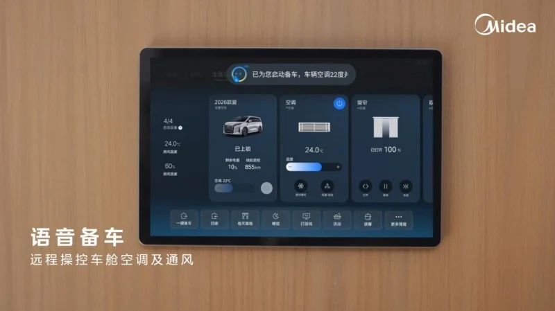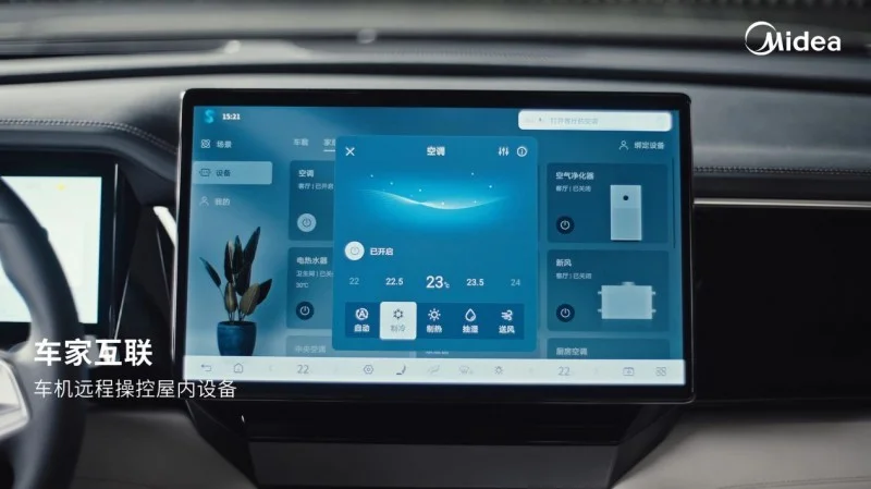 此次与比亚迪王朝网“夏”车型的合作,正是美的深度用户洞察的落地。作为比亚迪专为中国品质家庭打造的中大型智能旗舰MPV,“夏”本身以适配全家出行场景为核心定位,这与美的“全家庭场景智慧解决方案”的服务人群高度契合——双方核心用户均为注重家庭出行体验、追求生活效率与品质的群体,这种天然的用户属性共鸣为合作奠定了坚实基础,更快速验证了美的智慧生态的场景价值。通过携手比亚迪这一行业领军者,美的进一步拓展 “出行 + 居家” 场景闭环,推动智慧生活生态全场景落地。 双向联动,解锁全流程智慧生活新体验 依托美的全屋智能生态布局、小美AI智能体多模态智慧家庭 AI 管家能力,配合具备高精准语音交互、跨端协同控制核心能力的比亚迪DiLink智慧网联系统,双方聚焦用户出行与居家的高频场景,实现了“车控家”与“家控车”的双向智能联动,以及无感智能体验,让科技真正融入生活细节。 车控家:用户在行车途中,无需额外下载多端应用,通过比亚迪DiLink智慧网联系统即可实现对美的智能家居的多重便捷操作,如通过车机大屏触控界面,可实时查看家中电器运行状态,精准控制空调(含分体式及中央空调)、厨房空调、新风、电热水器、空气净化器、扫地机器人、取暖器、灯光、窗帘9大品类开关等模式。更支持语音唤醒比亚迪智能语音助手“小迪”,如一句“你好小迪!打开客厅空调”即可完成远程操控,让用户归家时即刻享受适宜温度、清新空气与备好的热水,告别等待烦恼。