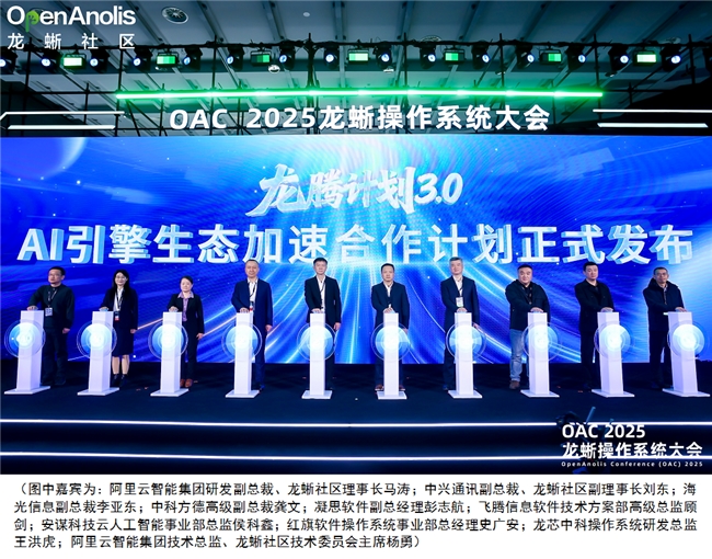 龙腾计划3.0——AI引擎生态加速合作计划发布仪式现场 会上,龙腾计划3.0——AI引擎生态加速合作计划正式发布,标志着龙蜥社区在推动操作系统与AI技术创新融合、以及利用AI驱动上下游产业合作变革方面迈出了重要的一步。该计划将聚合社区超过1000家产学研头部技术力量和资源,通过开源和商业双轮驱动模式,共同构建一个开放且具有创新活力的AI引擎生态系统。