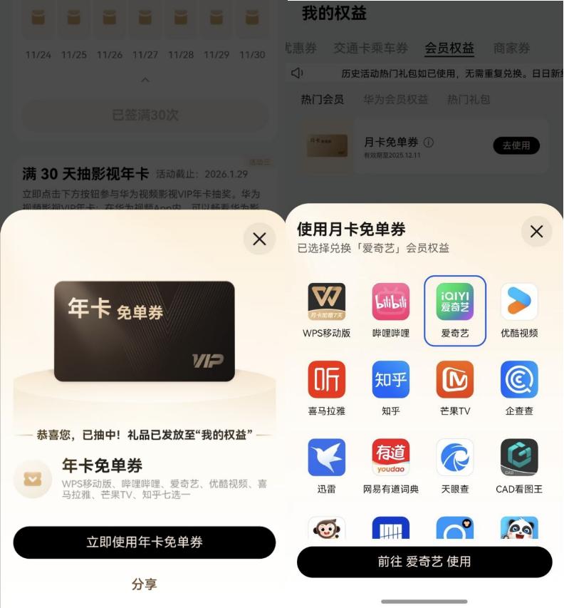 最最最重要的是,这次追剧我可没花钱买会员!“鸿蒙有礼”的签到福利直接承包了我整年的爱奇艺会员,谁能懂我一下抽中年卡免单券的那种惊喜,鸿蒙有礼就是来报恩的吧!