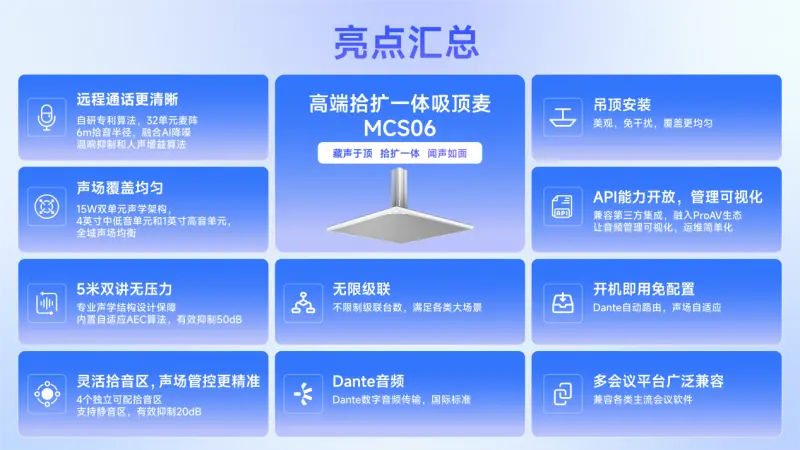 拾扩一体吸顶麦MCS06 隐形设计一键组网,打造简洁沉浸空间 针对20-60㎡空间打造的MCS06,以拾扩一体设计实现“全域清晰,无感体验”。其内置32单元高灵敏度麦克风阵列,搭配15w双单元声学结构,通过全域声场均衡技术,实现声压级±3dB均匀覆盖,彻底解决“后排听不清、角落没声音”的痛点。 核心技术方面,MCS06搭载自适应AI降噪引擎、智能增益调节、深度学习混响抑制三大算法,配合自适应AEC回声消除技术,实现5米范围内清晰双讲,远程沟通如面对面般自然。产品支持4个独立可配置拾音区与静音区智能隔离功能,精准捕捉目标声音,剔除无关干扰,与Dante转换器DU44搭配使用,初次上电即可自动组网,配置效率提升90%,大幅降低部署成本。