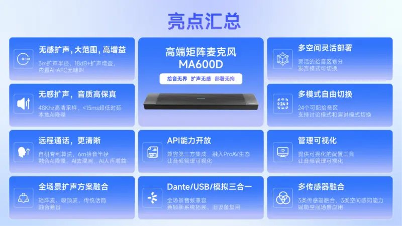 高端矩阵麦克风MA600D 灵活应对复杂声场,一机重构会议秩序 MA600D面向中大型会议室、指挥中心及多功能厅等专业场景,主打“一机多能、灵活分区”,以“单麦=10台传统设备”的颠覆性优势,掀起扩声领域的效能革命。其搭载64单元麦克风矩阵,实现3m扩声半径及18dB+扩声增益,内置AI-AFC无啸叫技术,配合思必驰ClearSpeakAI专利音频算法,实现AI降噪、AI去混响、AI人声增益、AI双讲通话等核心功能,更具备空间DOA、啸叫抑制、波束围栏等进阶能力,让人声清晰突出,环境干扰降至最低。