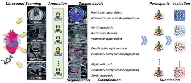 图片引用来源:美国超声心动图学会指南与规范 然而,胎儿心脏切面结构复杂、图像质量差异显著,且诊断过程高度依赖医生经验,使得结构精准解析与疾病判读仍面临巨大挑战。FETUS 2026旨在通过人工智能方法,提升胎儿心脏超声在结构解析与疾病筛查中的一致性、稳定性与效率,推动相关技术的临床落地与应用转化。 02挑战赛任务的流程 考虑到真实临床场景与标注成本约束,本次挑战赛设计为半监督的分割+分类联合任务: 多切面心脏结构自动分割 先天性心脏疾病类型智能诊断