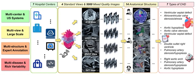 数据由多位专业超声医师参与构建与审核,确保医学可靠性与研究价值: 图像级分割掩码与疾病标签 高质量标注+多名高年资医师联合质控 03挑战赛的亮点 主办方联合了全国多家高水平医院构建了首个大规模,多中心,精细标注的胎儿心脏超声公开数据集。
