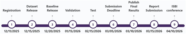 以格林尼治标准时间(UTC+0)为准: ⏰ 2025/12/11 → 注册:挑战赛注册开启。签署数据保密协议。 ⏰ 2025/12/16 → 发布训练数据集 ⏰ 2025/12/20 → 发布初始基线代码 ⏰ 2026/01/15 → 验证阶段开始 ⏰ 2026/02/15 → 测试阶段开始 ⏰ 2026/03/05 → 提交截止:注册入口关闭,验证与测试同时关闭(注:所有参赛者需在2026年3月5日前完成至少一次测试阶段的提交) ⏰ 2026/03/10 → 公布最终结果:主办方对提交的算法进行排名并公布最终结果 ⏰ 2026/03/15 → 参赛团队提交最终报告:完成算法提交的参赛队伍提交实现报告 ⏰ 2026/04/10 → 现场报告:ISBI大会开幕,主办方公布获奖名单并为获奖团队颁奖。英国皇家学会副主席,牛津大学终身教授Alison Noble院士将出席做主旨演讲。 06丰厚奖品 主办方还为参赛者准备了丰厚的奖金,以表彰为该领域做出突出贡献的选手: 🏆奖金设置 一等奖:800美元 二等奖:500美元 三等奖:300美元 第四至十名:各100美元 🏆证书颁发 主办方将在ISBI 2026大会期间,为最终排名前十的获奖者颁发表彰证书。 |