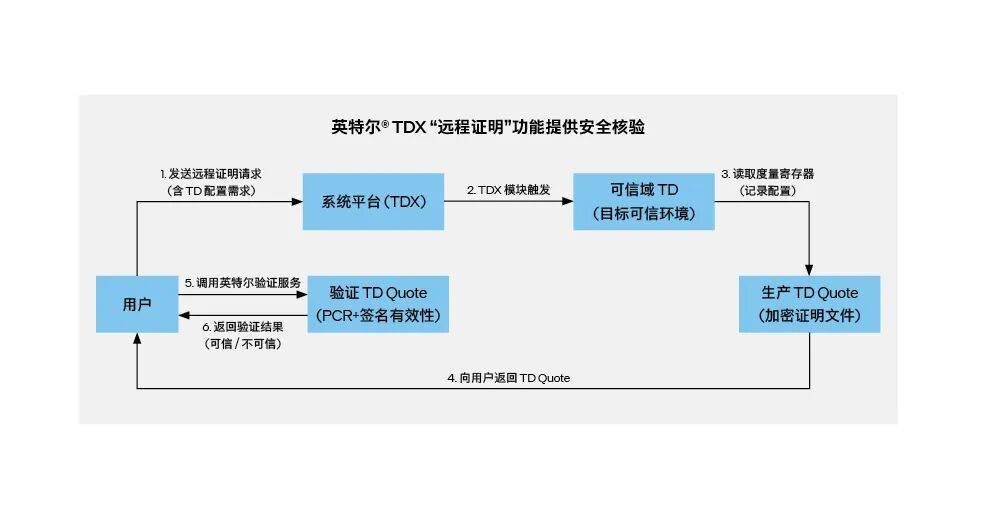 第二招:给“内存数据” 穿上防弹衣,运行全程加密 数据在计算时,总要在内存里走一遭,这是传统的数据防护技术最薄弱,甚至可以说是“裸奔”的环节。TDX通过结合英特尔® TME-MK技术,实现了对可信域内存数据的实时、全程加密。 第三招:入门先 “验明正身”,防止“无间道” 信任不能仅凭承诺,更需要可验证的机制。TDX的“远程证明”功能,允许用户在将敏感数据或模型部署到云端环境之前,确认了云端环境是原装正品、未经篡改才会继续工作。想玩“无间道”,门儿都没有。